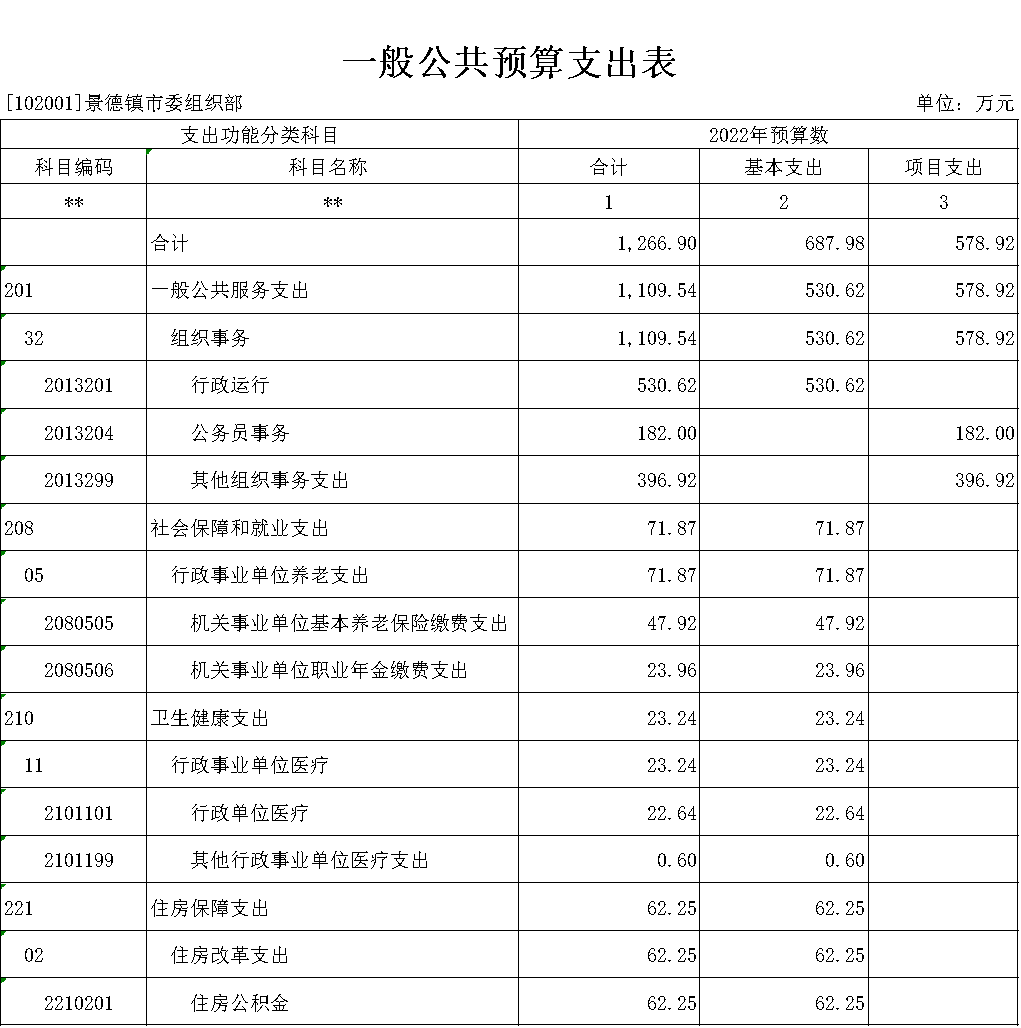 2022年景德镇市委组织部支出预算总额为1266.90万元,较上年预算安排减少939.14万元;其中: