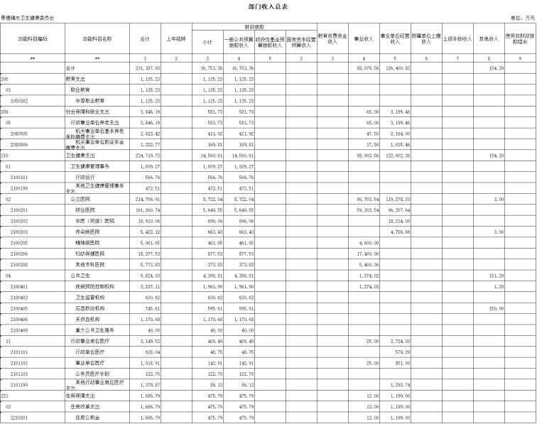 2、按支出功能科目划分:教育支出1135.23万元,较上年预算安排减少232.94万元;社会保障和就业支出6534.8万元,较上年预算安排增加减少1564.39万元;卫生健康支出220895.11万元,较上年预算安排减少63.95万元;住房保障支出2822.79万元,较上年预算安排增加243.72万元。