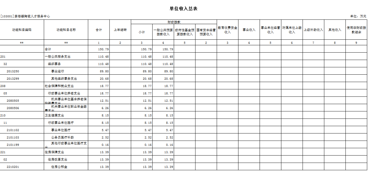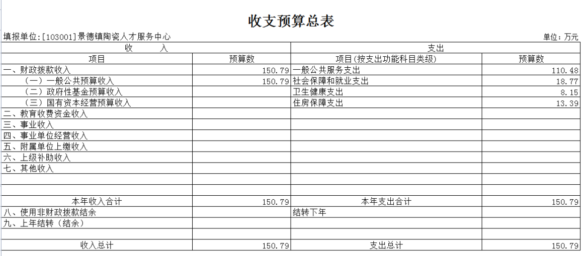 2022年景德镇陶瓷人才服务中心收入预算总额为150.79万元;财政拨款收入150.79万元,事业单位经营收入0万元;因本单位为2021年12月底正式挂牌成立的单位,无上年预算情况。