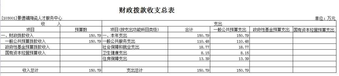 2022年景德镇陶瓷人才服务中心财政拨款支出预算总额150.79万元;因本单位为2021年12月底正式挂牌成立的单位,无上年预算情况。