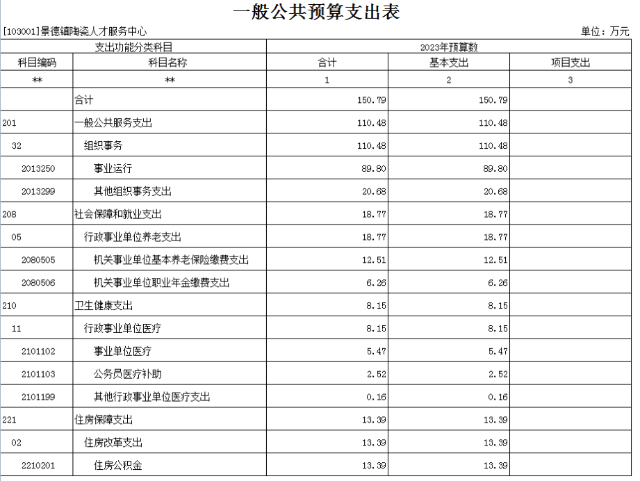 2022年景德镇陶瓷人才服务中心支出预算总额150.79万元,因本单位为2021年12月底正式挂牌成立的单位,无上年预算情况;其中:
