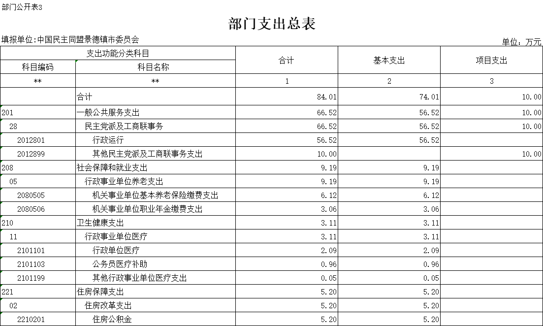 2023年中国民主同盟景德镇市委员会部门支出预算总额为84.01万元,较上年预算安排增加14.89万元;其中:按支出项目类别划分:基本支出74.01万元,较上年预算安排增加22.09万元;其中:工资福利支出65.69万元, 商品和服务支出8.32万元,对个人和家庭的补助0万元,资本性