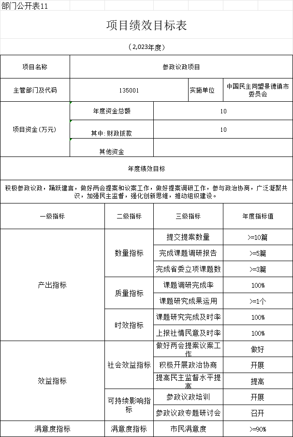 十一、《项目绩效目标表》