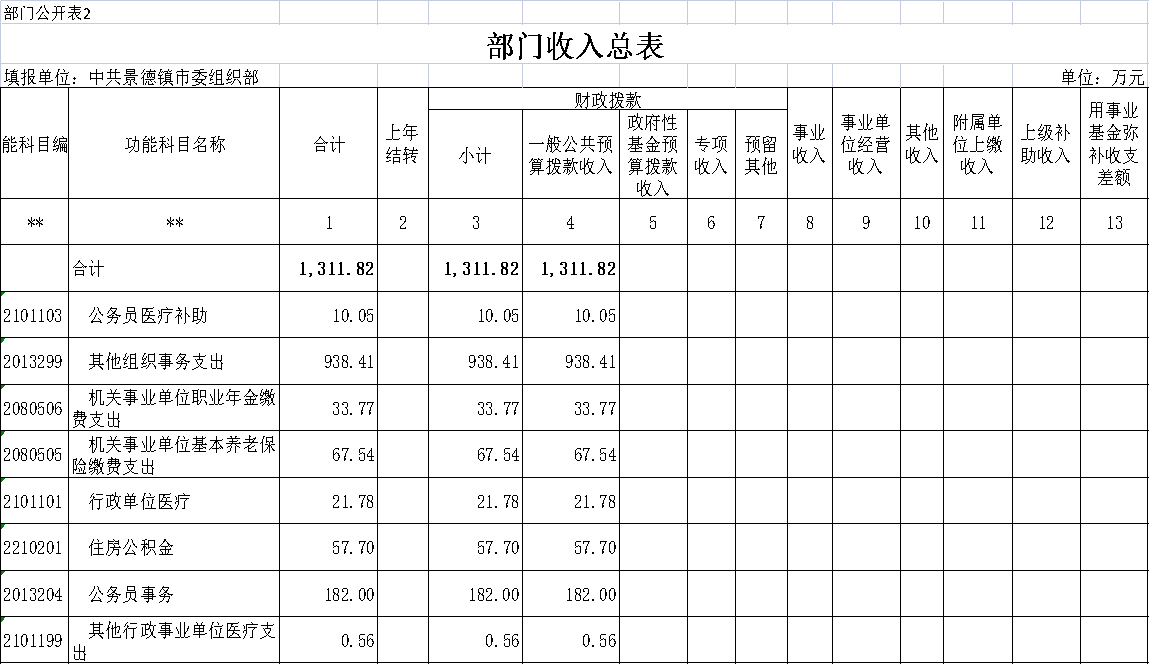 2023年市委组织部收入预算总额为1311.82万元,与上年预算相比增加44.92万元,上涨3.55%,主要原因是:增加基础性绩效工资。其中:当年财政拨款收入1311.82万元,占收入预算总额的100%;一般公共预算收入1311.82万元。