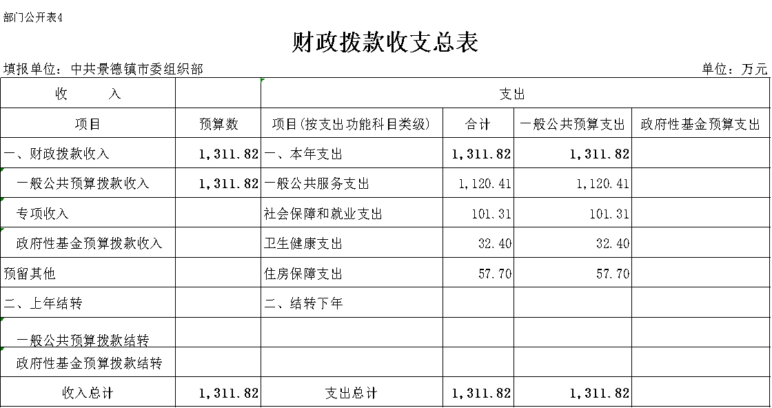 2023年市委组织部财政拨款支出预算1311.82万元,占支出预算总额的100%。具体支出情况是:一般公共服务支出1120.41万元,占财政拨款支出预算的85.4%;社会保障和就业支出101.31万元,占财政拨款支出预算的7.7%;卫生健康支出32.40万元,占财政拨款支出预算的2.5%;住房保障支出57.70万元,占财政拨款支出预算的4.4%。