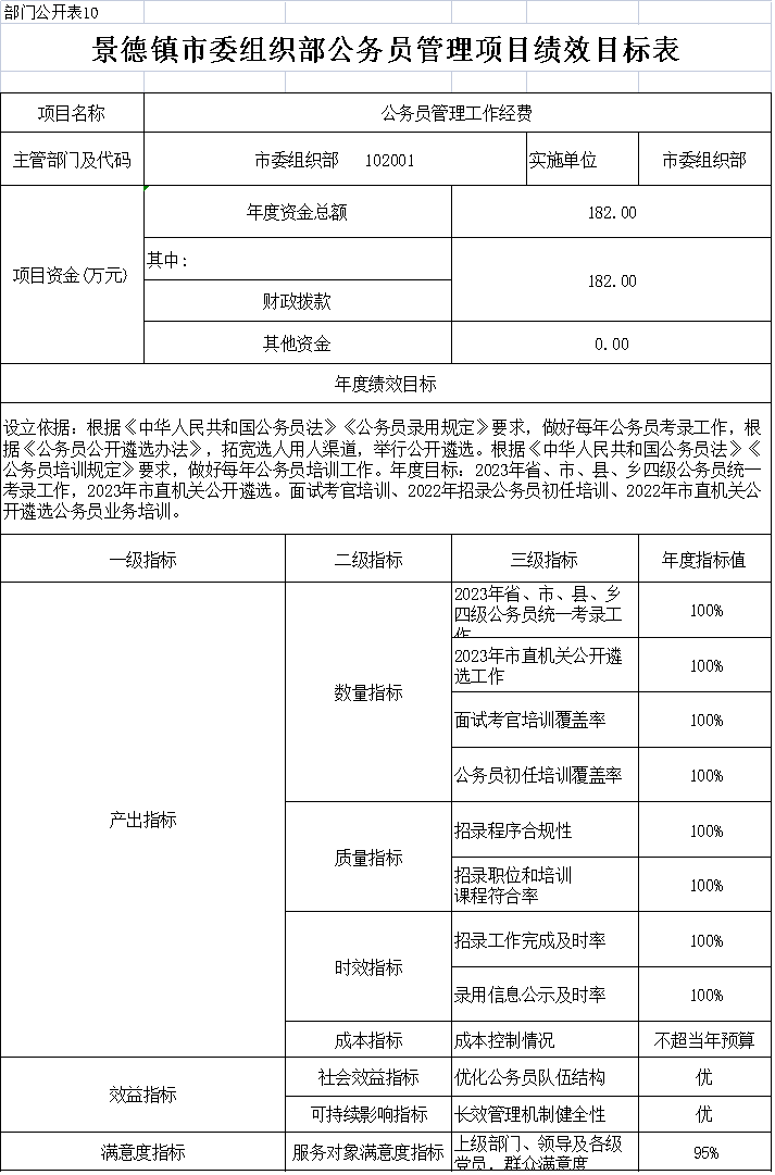 市委组织部二级项目(公务员管理工作)年度预算安排:182万元。绩效目标和指标:目标1:省、市、县、乡四级公务员统一考录工作,以及市直机关公开遴选;目标2:面试考官培训;目标3:公务员初任培训。