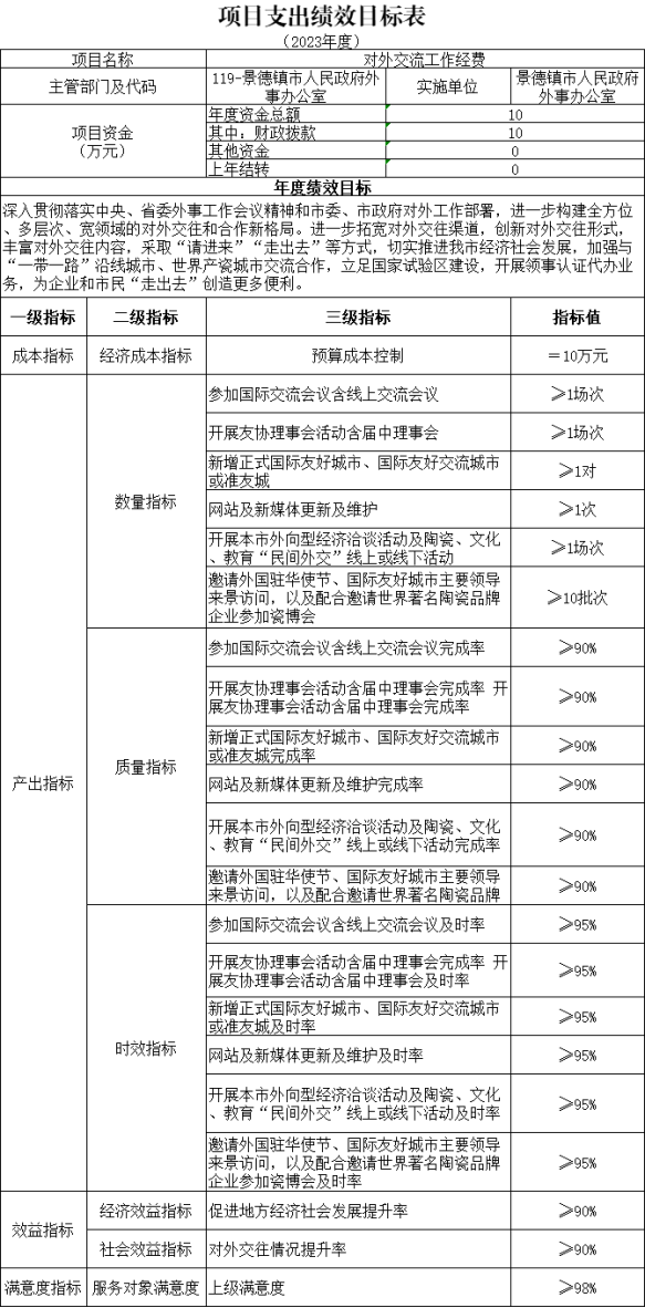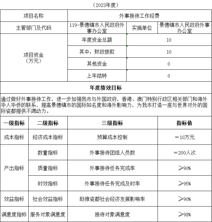 2023年部门整体绩效目标:根据我办工作职能,在常态化涉外疫情防控情况下,加强因公国(境)审核审批和邀请外国人来赣事项核实等外事管理,提高服务意识,切实做好签证等业务工作,为公民和企事业组织提供优质高效服务,助力景德镇国家陶瓷文化传承创新试验区建设。