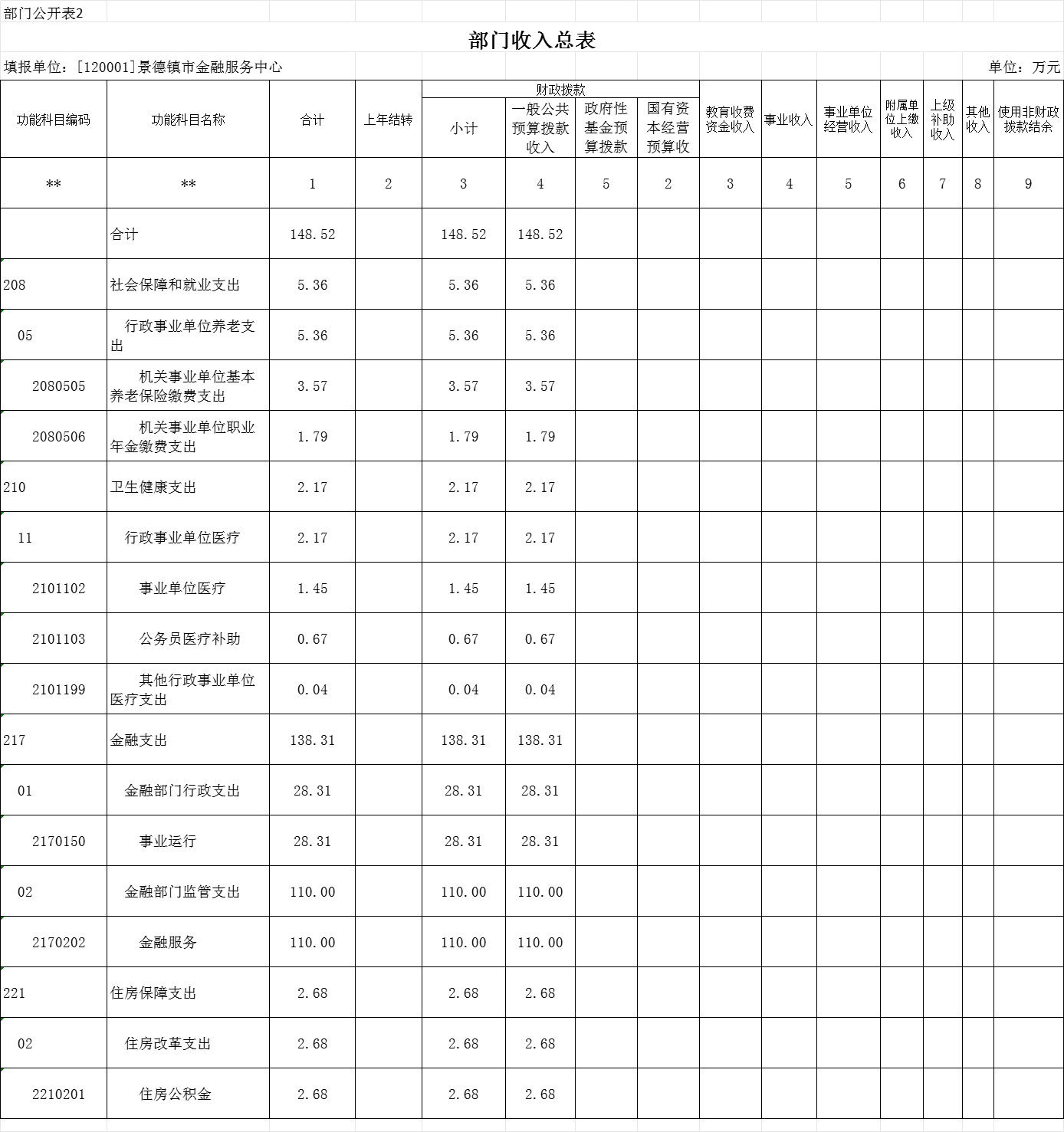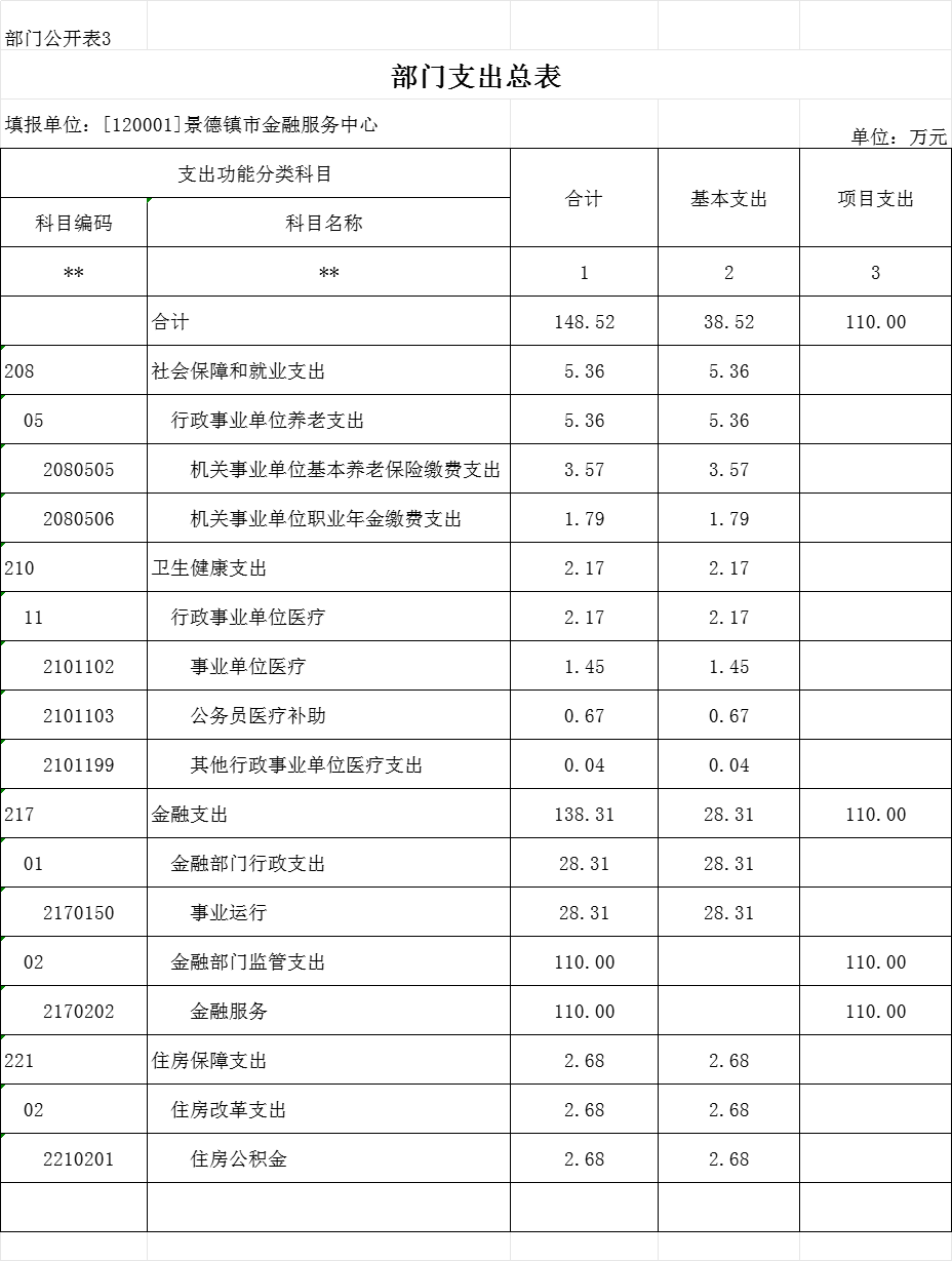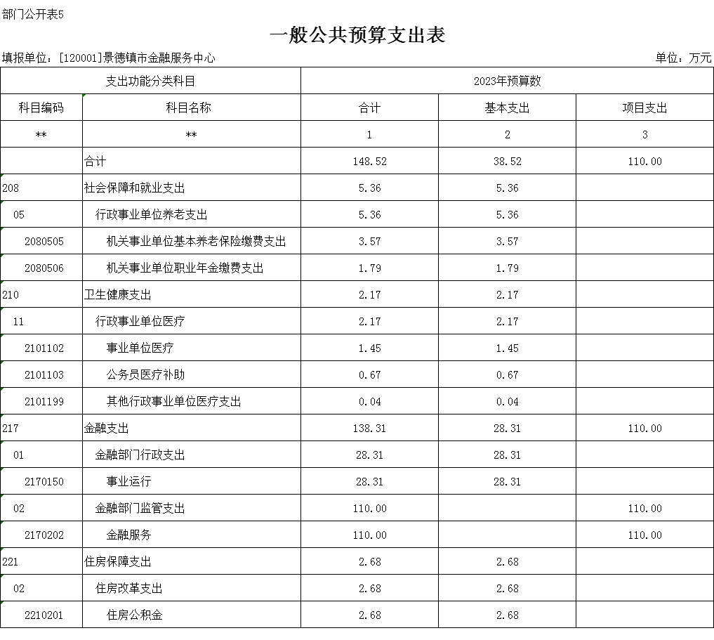 按支出功能科目划分:金融支出138.31万元,社会保障和就业支出5.36万元,卫生健康支出2.17万元,住房保障支出2.68万元。