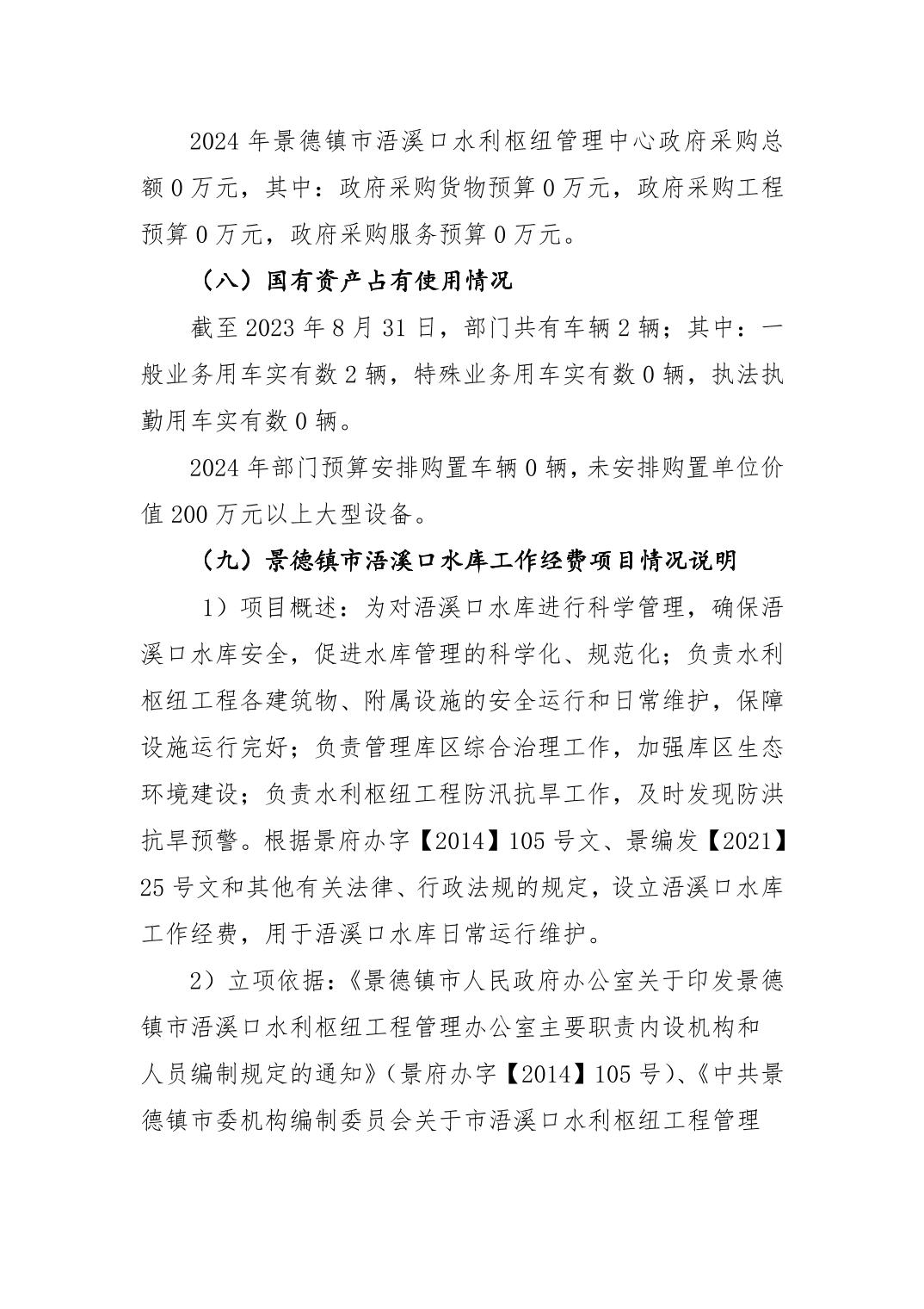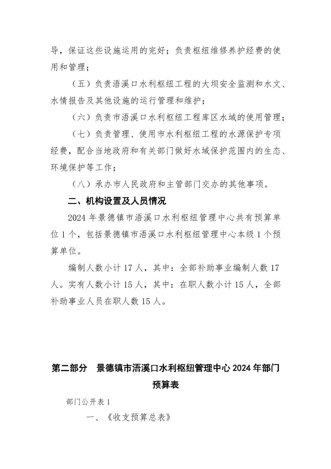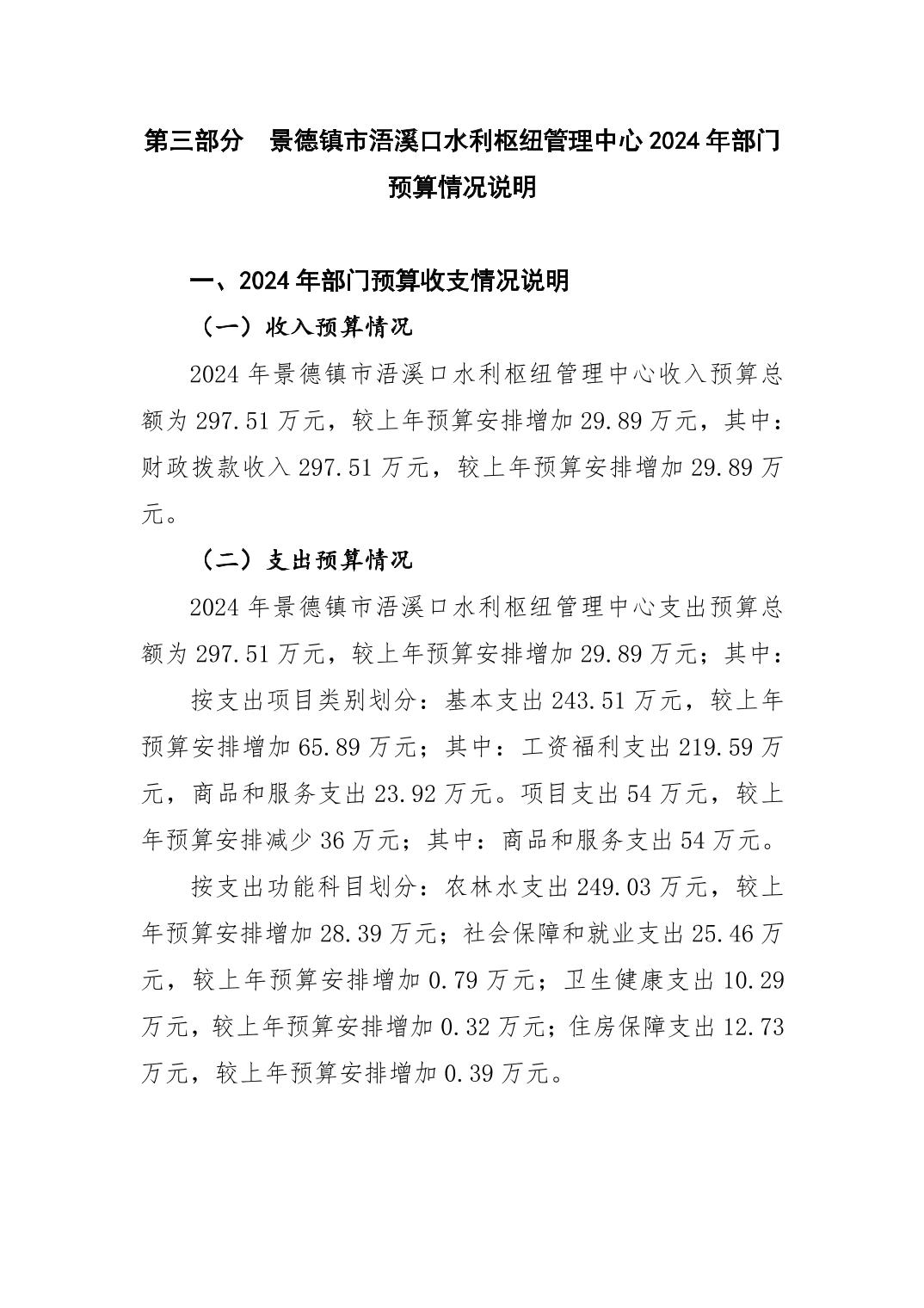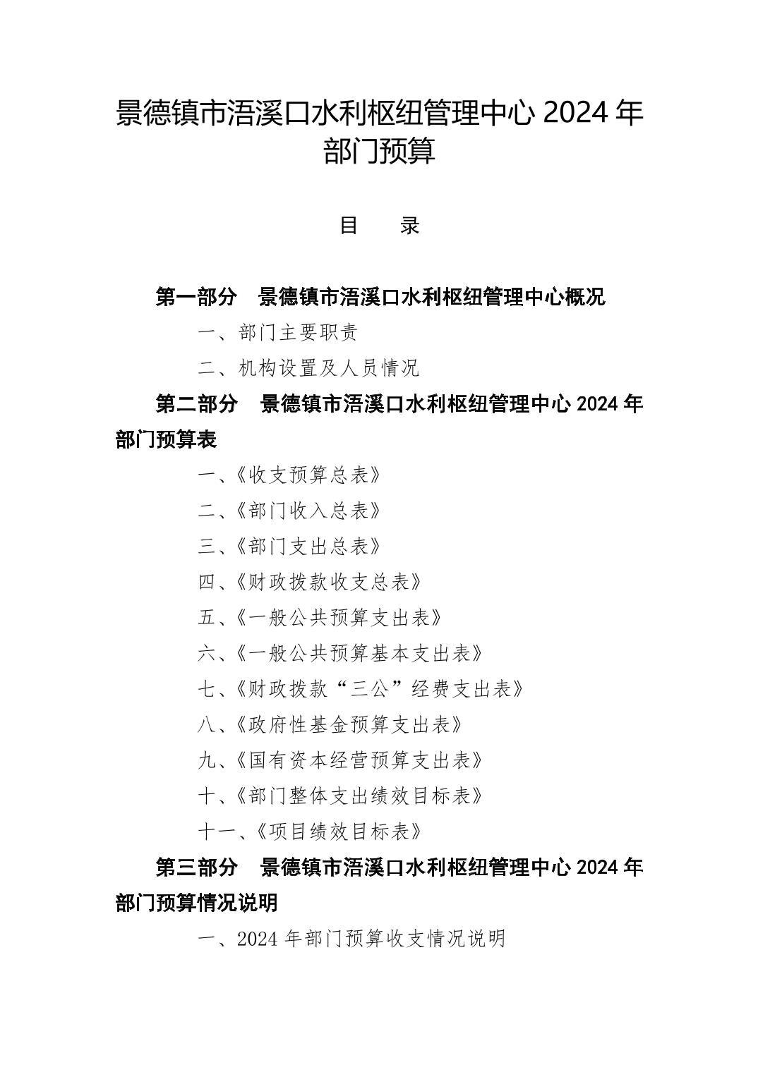 景德镇市浯溪口水利枢纽管理中心2024年部门预算
