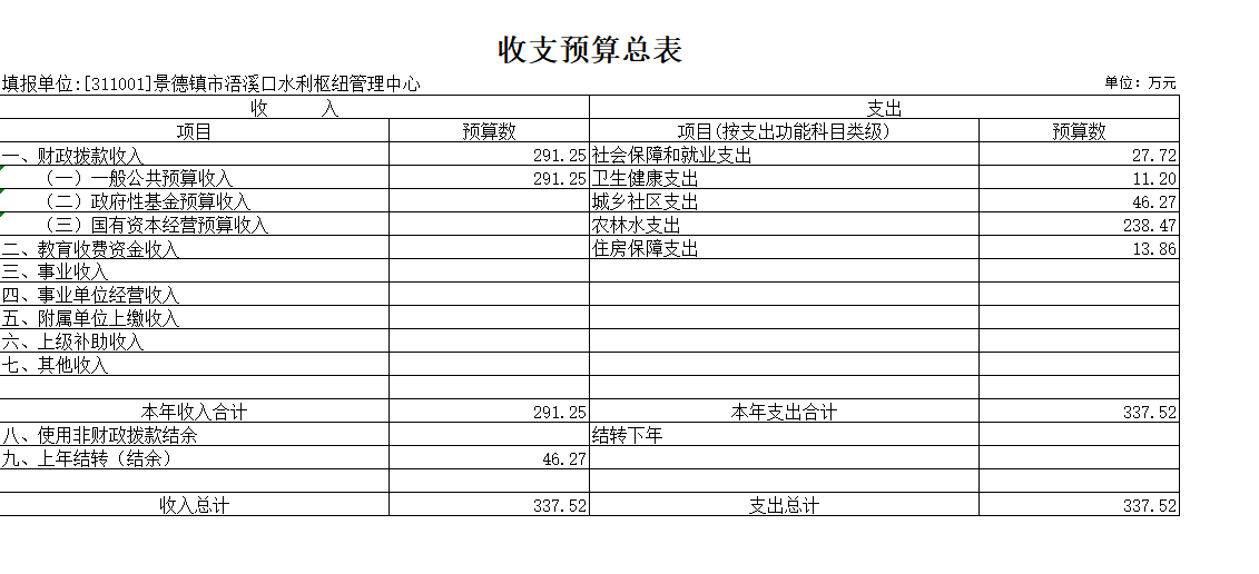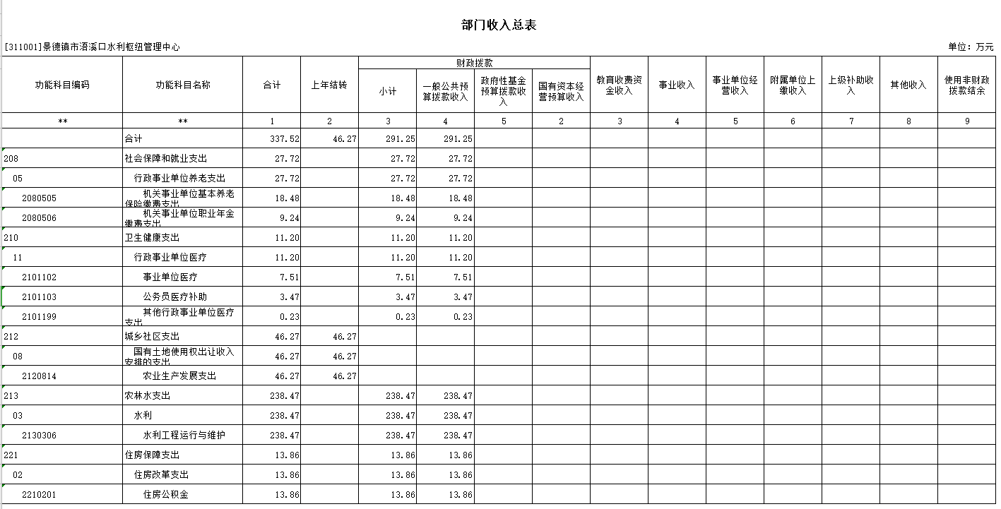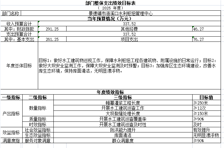 2025年景德镇市浯溪口水利枢纽管理中心财政拨款支出预算总额337.52万元,较上年预算安排增加40.01万元;