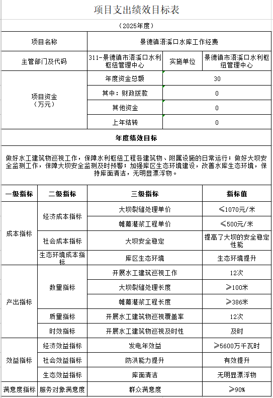 为对浯溪口水库进行科学管理,确保浯溪口水库安全,促进水库管理的科学化、规范化;负责水利枢纽工程各建筑物、附属设施的安全运行和日常维护,保障设施运行完好;负责管理库区综合治理工作,加强库区生态环境建设;负责水利枢纽工程防汛抗旱工作,及时发现防洪抗旱预警。根据景府办字【2014】105号文、景编发【2021】25号文和其他有关法律、行政法规的规定,设立浯溪口水库工作经费,用于浯溪口水库日常运行维护。