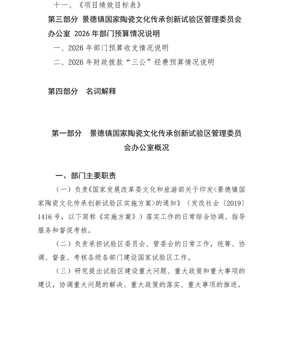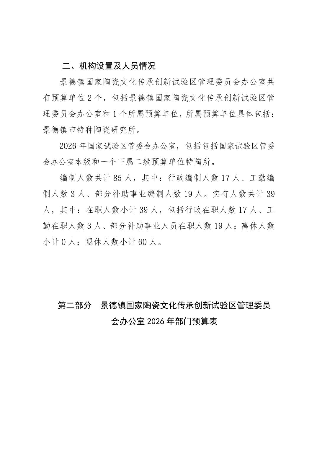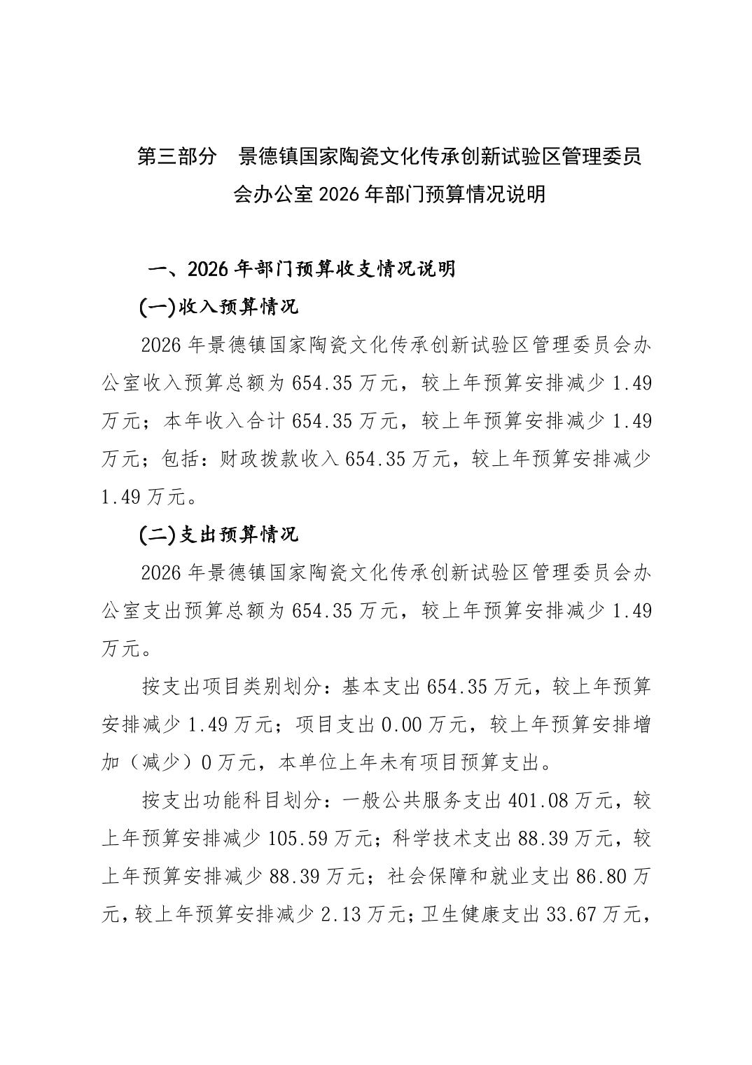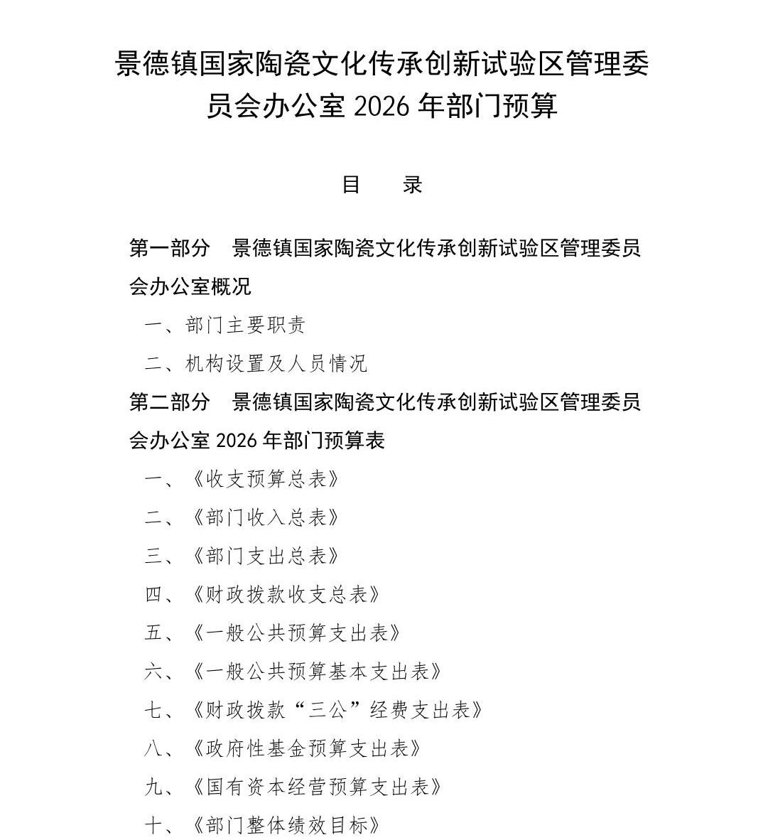 景德镇国家陶瓷文化传承创新试验区管理委员会办公室2026年部门预算