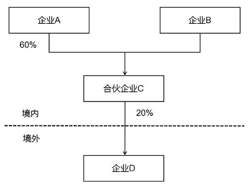 二是居民企业通过境内合伙企业,符合信息报告条件的,需由合伙企业合伙人作为报告人填写《报告表》。示例2投资架构如下,居民企业A和居民企业B通过境内合伙企业C持有外国企业D股份。按照合伙协议,各合伙人按照出资比例享有合伙企业份额,居民企业A享有合伙企业C 60%的财产份额和利润分配比例,合伙企业C持有外国企业D 20%股份,居民企业A视同持有外国企业D股份为60%×20%=12%,符合本公告规定条件,居民企业A应作为报告人填写《报告表》,境内合伙企业C无需填写《报告表》。