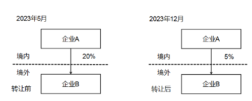 二是若一个纳税年度中间发生股权转让,导致年末持股比例不足10%的,仍需报告被转让境外被投资企业,报告人在填报“外国企业生产经营信息”时,可以填报转让前最近一期的数据。示例4投资架构如下,居民企业A在2023年5月取得外国企业B股份为20%,并于2023年8月转让15%的股份,2023年末持有外国企业B股份为5%,居民企业A在2023年度持有外国企业B的股份超过10%,符合本公告规定条件,居民企业A应就外国企业B填报《报告表》,其中第10栏“报告人持股比例(年末数)”“直接持股”应填写5%。