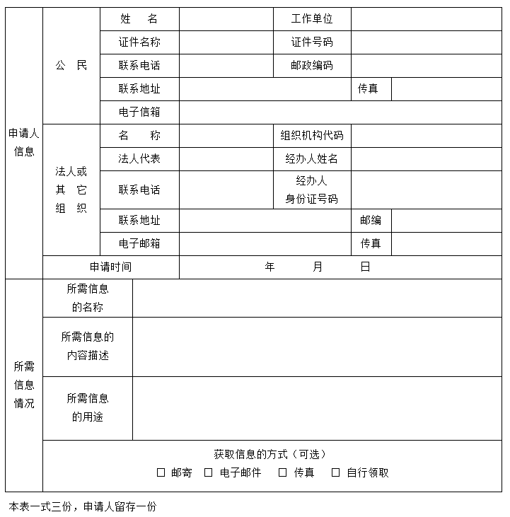 向管理中心提出申请的,填写《景德镇市住房公积金管理中心信息公开申请表》(样表附后,以下简称《申请表》)。申请表复制有效,可以在管理中心秘书科领取,也可以在景德镇市住房公积金管理中心门户网站下载电子版。为了提高处理申请的效率,申请人对所需信息的描述请尽量详细、明确;若有可能,请提供该信息的标题、发布时间、文号或者其他有助于本机关确定信息载体的提示。