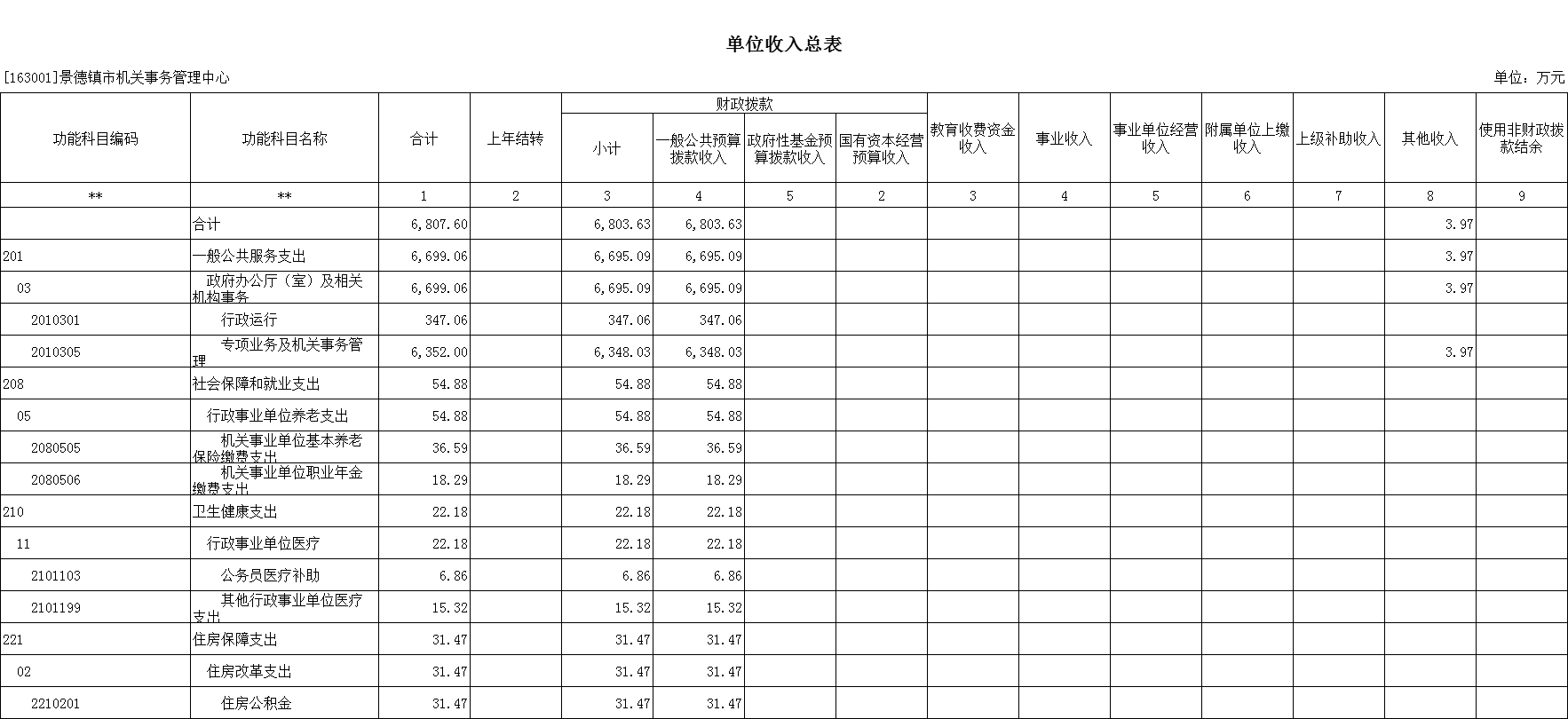 2025年景德镇市机关事务管理中心收入预算总额为6807.6万元,较上年预算安排减少1000.93万元,其中:财政拨款收入6803.63万元,较上年预算安排减少1004.9万元;其他收入3.97万元,较上年预算安排增加3.97万元。