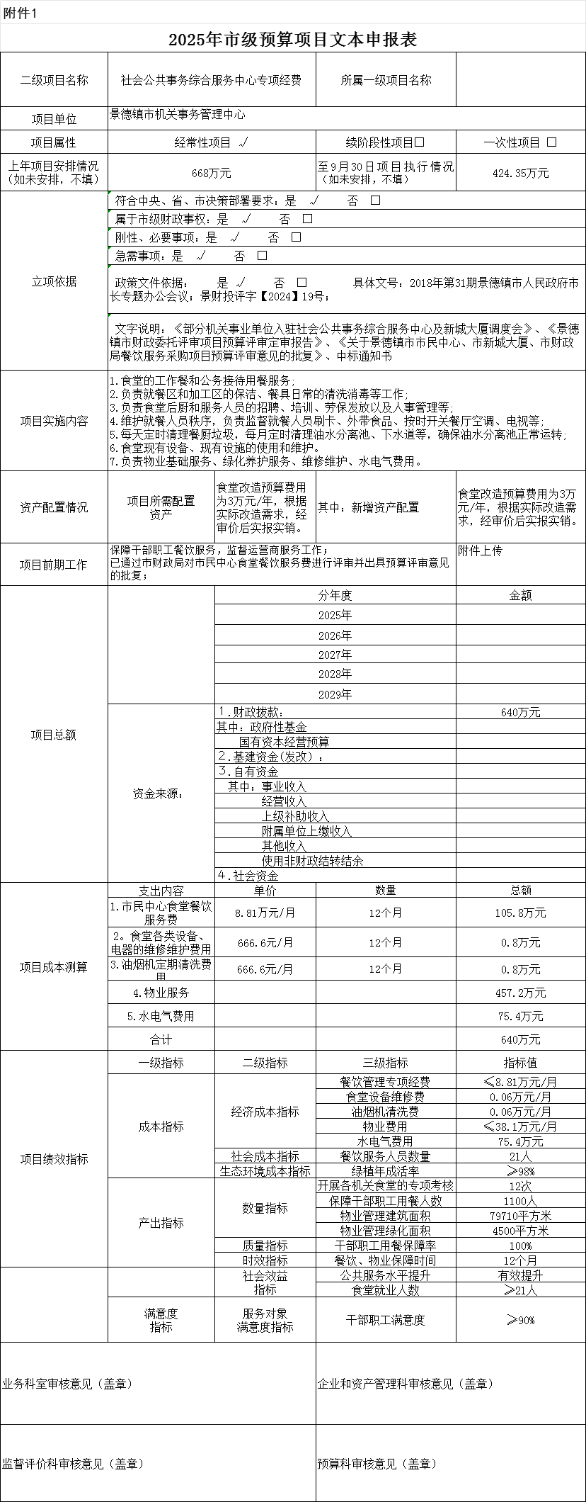 《部分机关事业单位入驻社会公共事务综合服务中心及新城大厦调度会》、《景德镇市财政委托评审项目预算评审定审报告》、《关于景德镇市市民中心、市新城大厦、市财政局餐饮服务采购项目预算评审意见的批复》、中标通知书