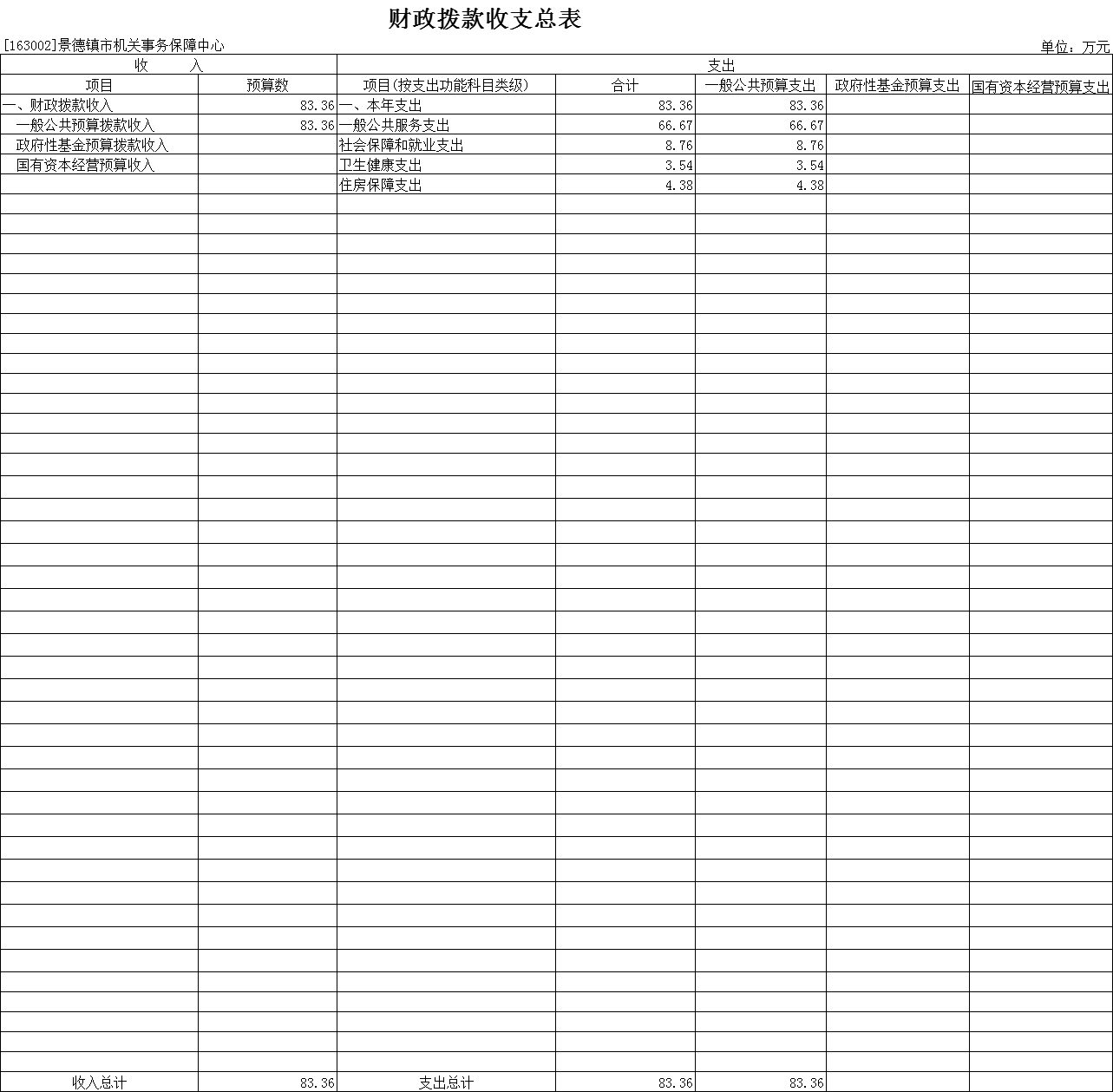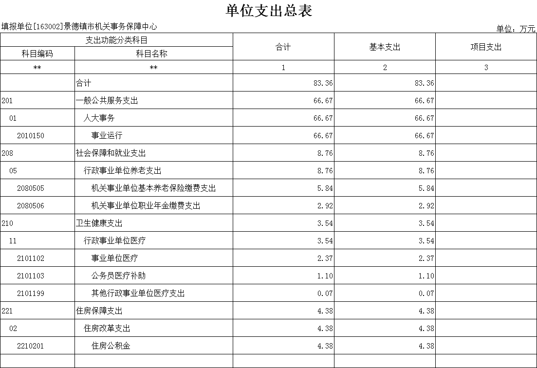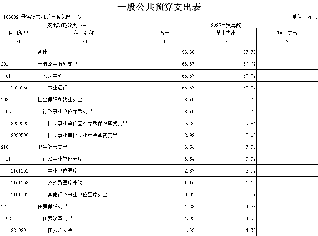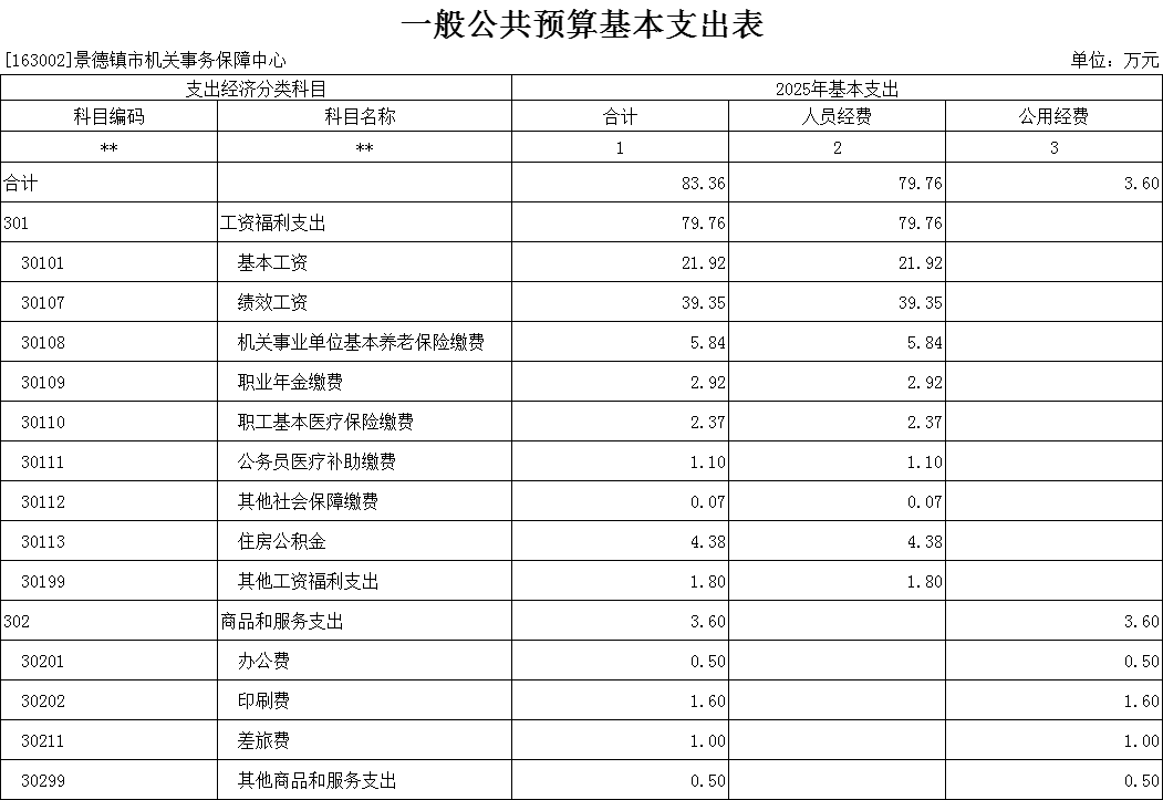 2025年景德镇市机关事务保障中心支出预算总额为83.36万元,较上年预算安排增加4.6万元;其中: