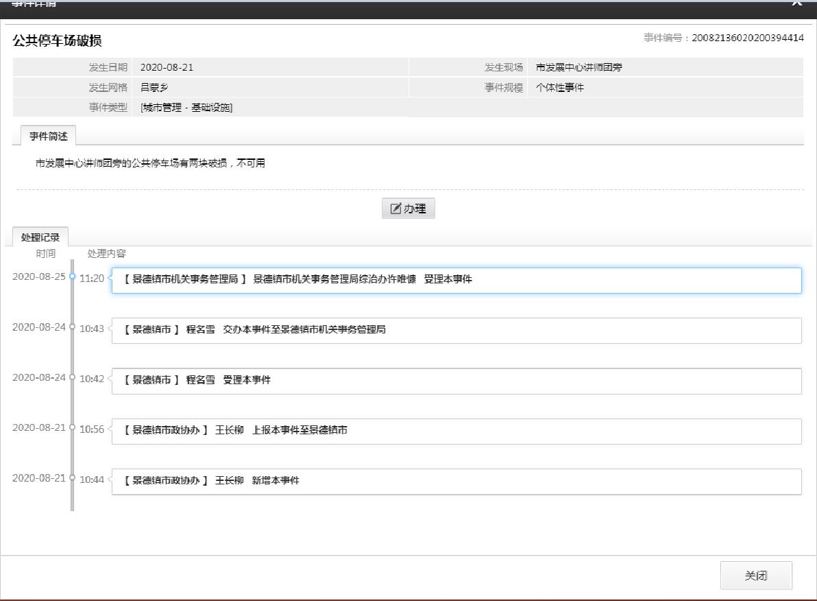 事件简述:市发展中心讲师团的公共停车场有两块破损,不可用。