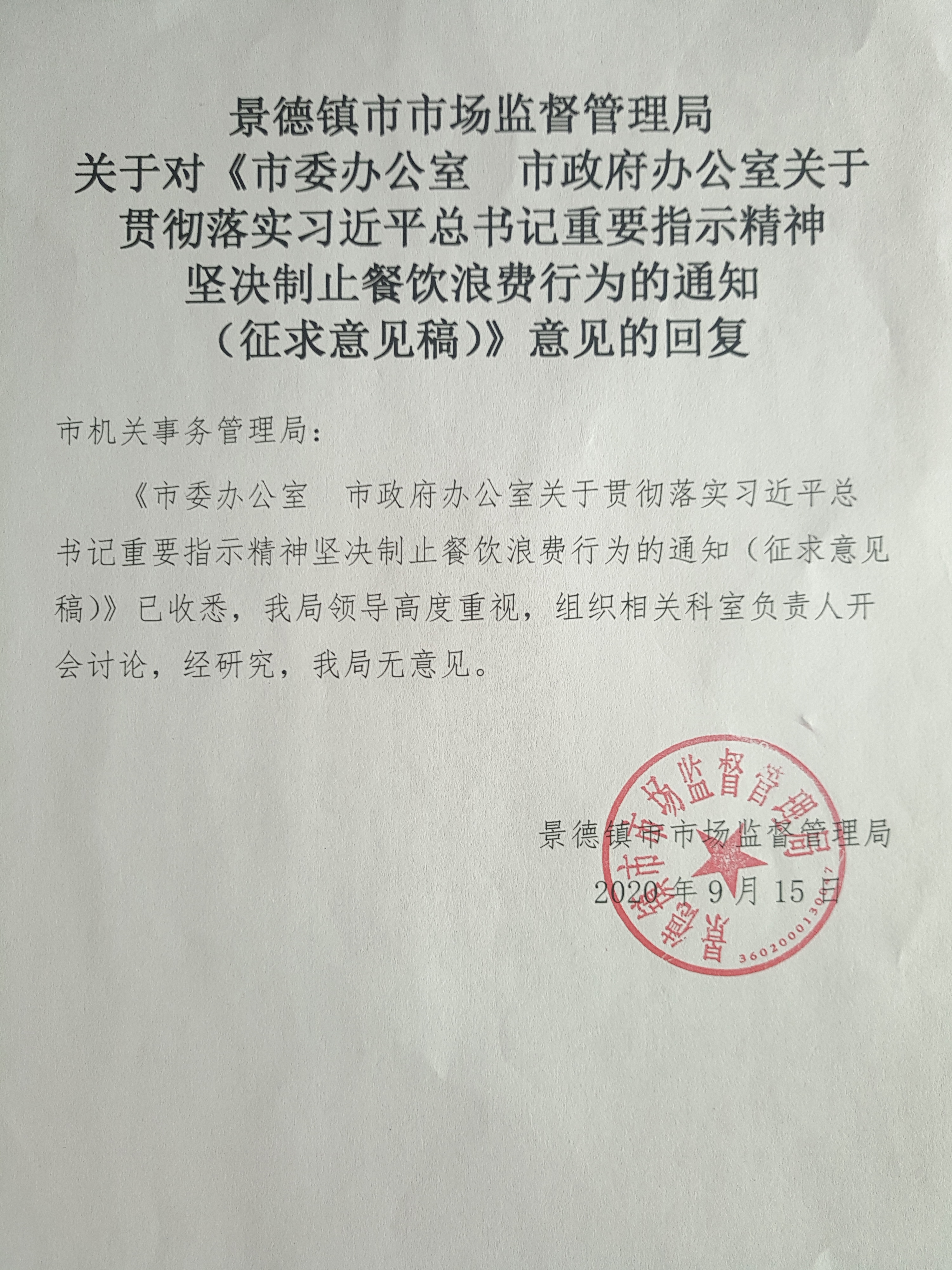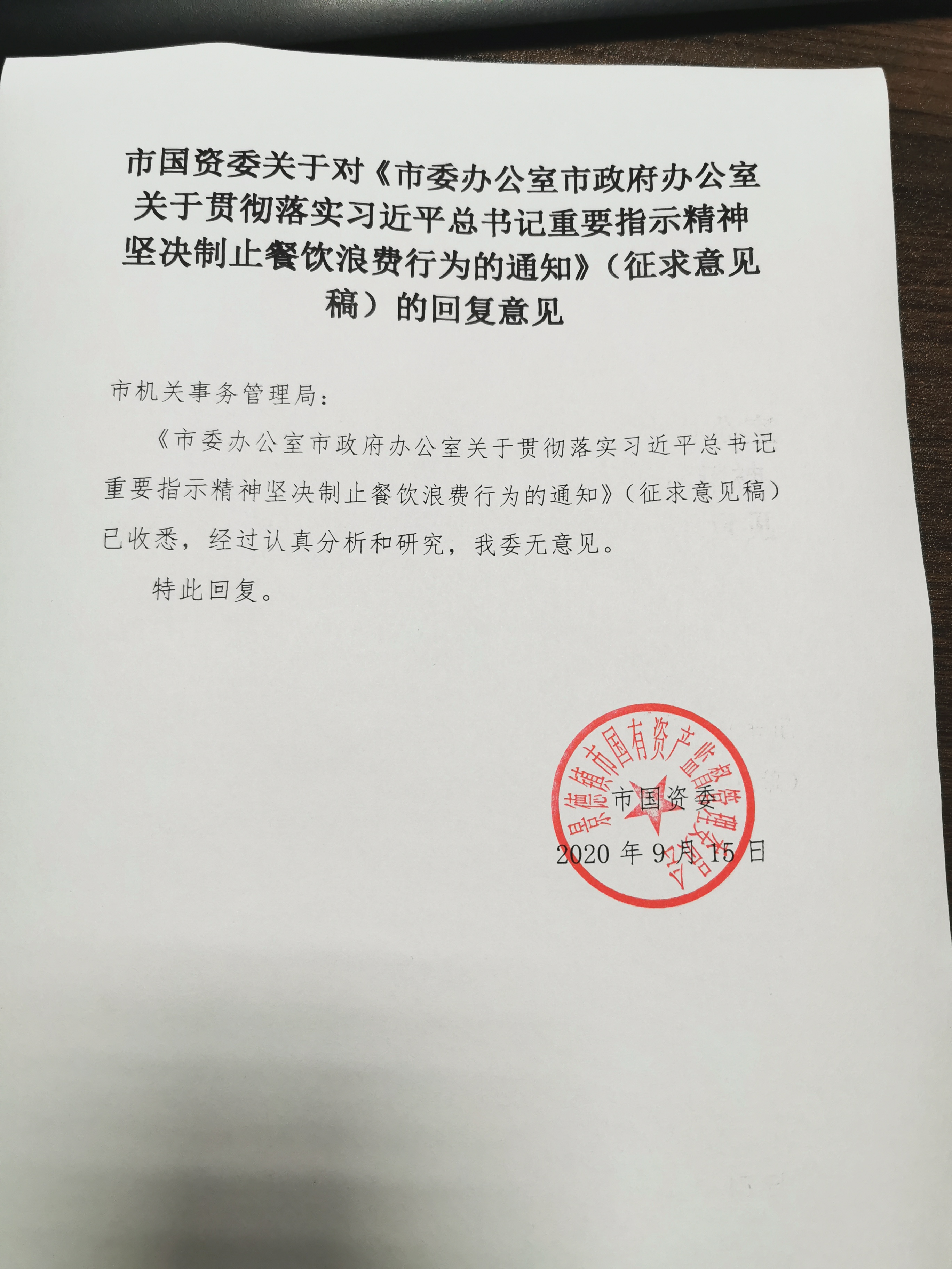 为贯彻落实习近平总书记关于制止餐饮浪费、培养节约习惯作出的重要指示精神,根据市领导要求,由我局牵头起草了《市委办公室市政府办公室关于贯彻落实习近平总书记重要指示精神坚决制止餐饮浪费行为的通知》,现征求贵单位意见建议,请贵单位提出高质量的意见建议,并于9月15(本周二)17:00前将修改意见反馈至市机关事务管理局。
