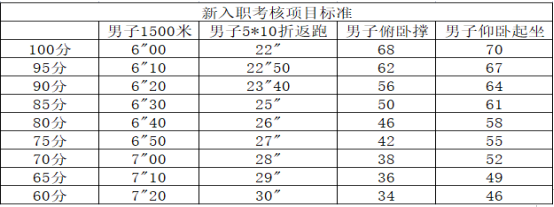 1.体能:体能测试满分100分,内容为1500米跑、5x10米折返跑、俯卧撑、仰卧起坐四个项目。1500米跑占体能成绩40%、男子5x10米折返跑占体能成绩20%、俯卧撑占体能成绩20%、仰卧起坐占体能成绩20%。