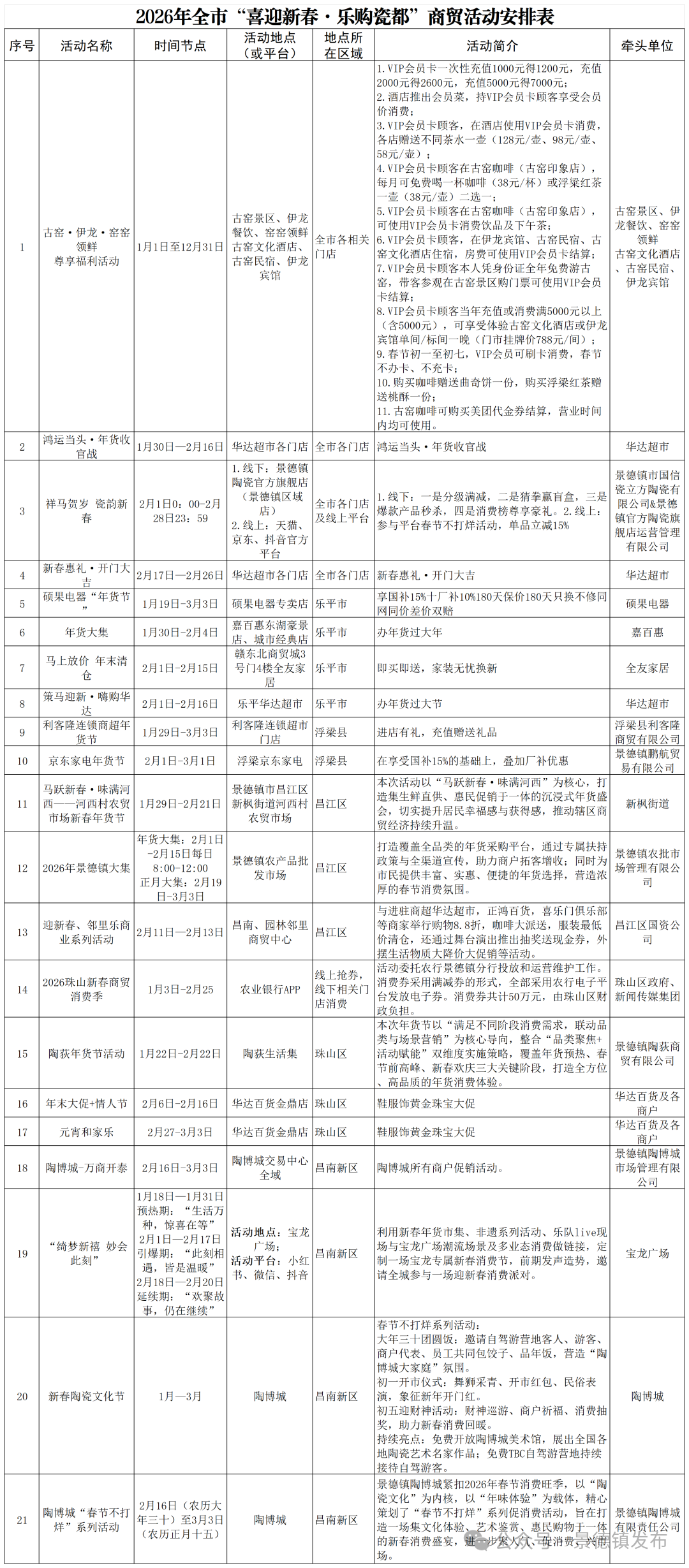 为营造欢乐祥和的节日氛围,进一步激发消费市场活力,景德镇市将于2026年春节期间全面启动“喜迎新春·乐购瓷都”系列促消费活动。本次活动整合商贸、文旅、住房、消费品以旧换新等多领域资源,推出一系列内容丰富、形式多样的惠民消费举措,为全市居民和游客献上一场精彩纷呈的消费盛宴。