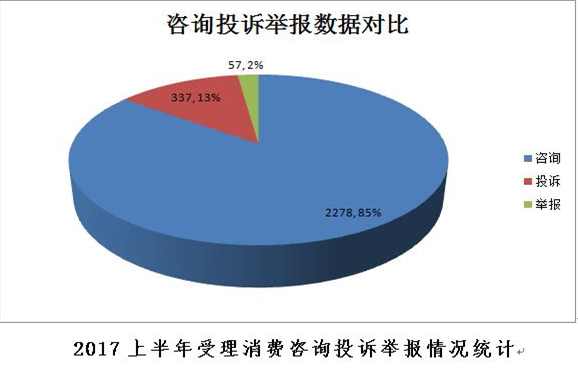2017上半年投诉举报中心共接听投诉电话近2672个,回答各类来电咨询2038余个,现场咨询240起,受理投诉337件,办结293件,办结率86.9%;举报57件,办结42件;调解成功236件,调解成功率80.5%;解决争议金额44.78万元,挽回消费者经济损失21.73万元。其中涉及食品药品接收投诉举报信息197条,其中受理投诉举报33件、咨询150件、意见建议9件,主要集中在餐饮服务和使用环节投诉举报。