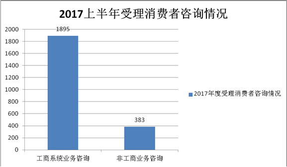 2017上半年共受理消费者咨询2278件,其中工商系统业务咨询1895件,占总咨询总量的83.2%;非工商业务咨询383件,占总咨询总量的16.8%。咨询主要涉及有关商品质量、投诉举报处理、注册登记类咨询包括营业执照、食品经营许可证如何办理及办理需要那些材料等。