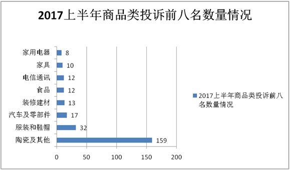 1.商品类投诉。共受理商品类投诉261件,占投诉总量的77.4%。其中投诉量前八位是:陶瓷及其他类159件、服装和鞋帽类32件、汽车及零部件17件、装修建材类13件、食品类12件、电信通讯类12件、家具类10年、家用电器类8件。