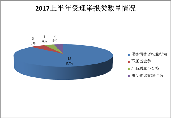 (三)举报分析。共受理共受理消费者举报57件,其中侵害消费者权益行为48件、不正当竞争行为3件、产品质量不合格2件、违反登记管理行为2件。