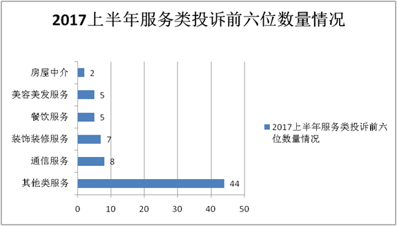 2.服务类投诉。共受理服务类投诉76件,占投诉总量的22.6%。排名前六位的是:其他服务类44件、通信服务类8件、装饰装修服务类7件、餐饮服务类5件、美容美发服务类5件、房屋中介类2件。
