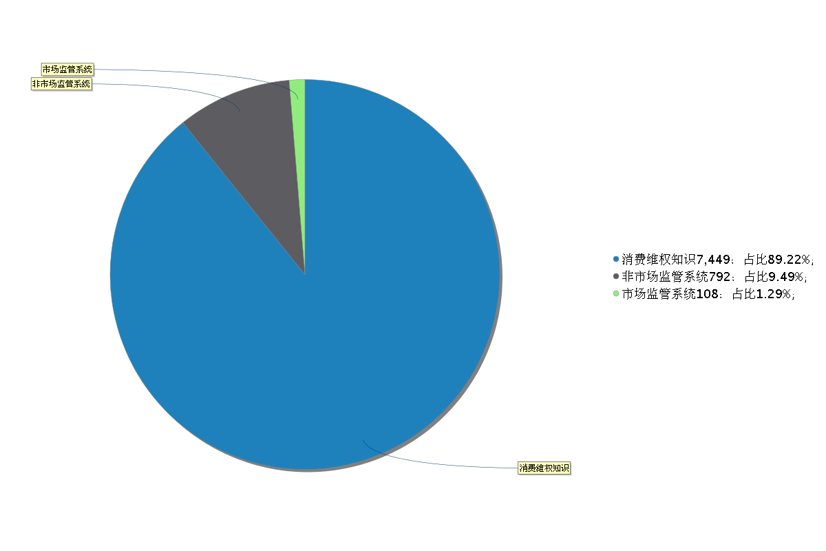 从咨询问题的类别来看,咨询量较大的问题主要有消费维权知识(7449件)、非市场监管系统(792件)、市场主体登记注册(80件)、其他市场监管系统问题(7件)、投诉举报处理(5件),合计占比99.86%。