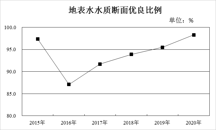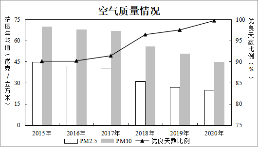 环境质量保持全省领先。“十三五”时期,全市环境质量在全省处于领先水平,“十三五”规划纲要及污染防治攻坚战确定的各项生态指标任务均超额完成。2020年,全市空气质量优良天数比率99.7%,较2015年提升9.6个百分点;PM2.5平均浓度25微克/立方米,较2015年下降44.4%,空气质量全省第一。地表水断面水质优良比例为98.3%,较2015年提高0.9个百分点,考核断面达标比例为100%,全面完成省委、省政府下达的消灭劣V类水任务,集中式饮用水水源地水质达标比例保持100%,水环境质量全省第二。全市受污染耕地安全利用率达到93%,污染地块安全利用率达到100%。区域环境噪声和道路交通噪声环境质量均保持较好水平。“十三五”主要污染物减排任务圆满完成,二氧化硫、氮氧化物、化学需氧量、氨氮排放量较2015年分别下降8.57%、2.95%、4.73%、4.62%,分别好于目标值3.28、0.27、0.43、1.94个百分点。