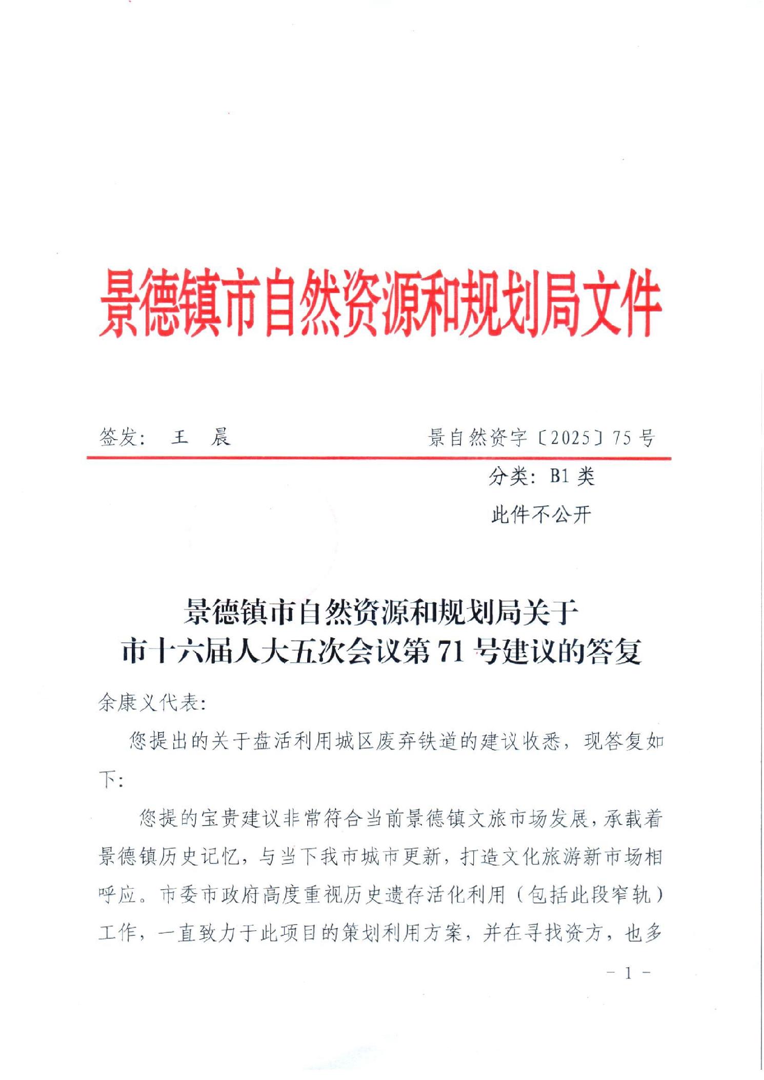 景德镇市自然资源和规划局关于市十六届人大五次会议第71号建议的答复