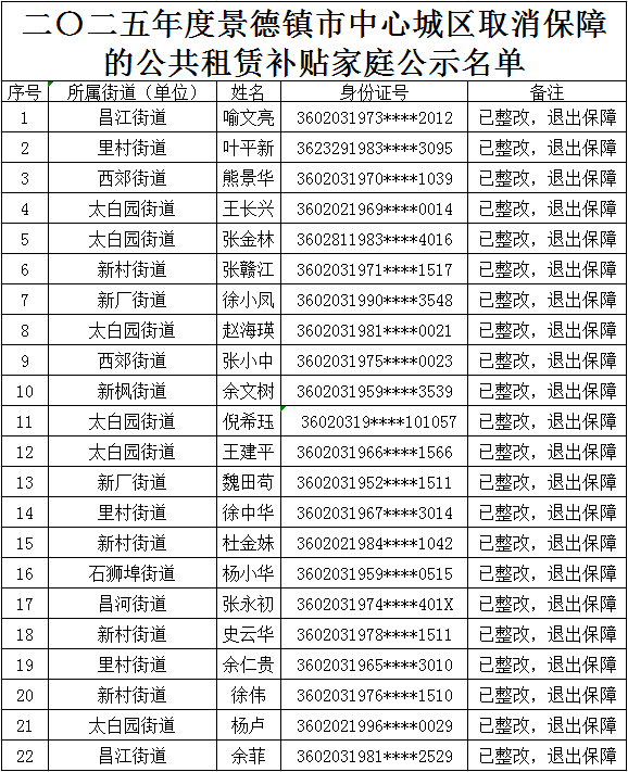 因审计查询,以下公租房租赁补贴家庭不符合公租房租赁条件,景德镇住房保障中心已做出整改,依据《公共租赁住房管理办法》(住建部第11号令)、《关于加快发展公共租赁住房的指导意见》(建保【2010】87号)、《公共租赁住房管理办法》景府办发〔2023〕7 号等相关文件对保障房实行动态管理的要求,现对上述住房保障对象作出取消其相应住房保障资格的决定。
