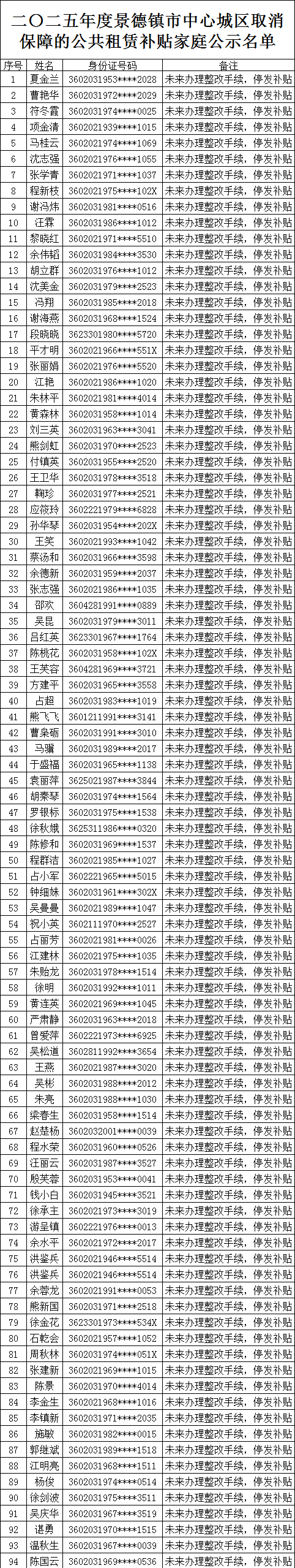 因审计查询,以下公租房租赁补贴家庭不符合公租房租赁条件,已多次电话.短信通知未在规定时间节点内前来办理整改手续,依据《公共租赁住房管理办法》(住建部第11号令)、《关于加快发展公共租赁住房的指导意见》(建保【2010】87号)、《公共租赁住房管理办法》景府办发〔2023〕7 号等相关文件对保障房实行动态管理的要求,现对上述住房保障对象作出取消其相应住房保障资格的决定。