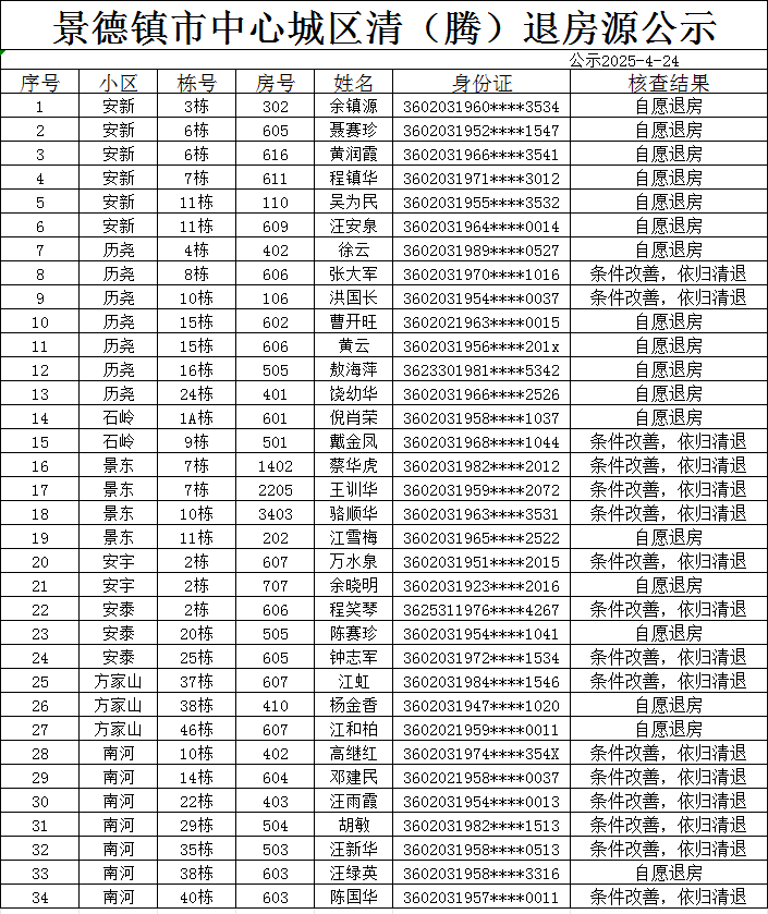 通过年审,经审核 ,历尧,安新,安泰,景东安厦,南河,石岭,安宇,方家山共有34户住房保障对象,因条件改善自愿退出。依据《公共租赁住房管理办法》(住建部第11号令)、《关于加快发展公共租赁住房的指导意见》(建保【2010】87号)、《公共租赁住房管理办法》景府办发〔2023〕7 号等相关文件对保障房实行动态管理的要求,现对上述住房保障对象作出取消其相应住房保障资格的决定。