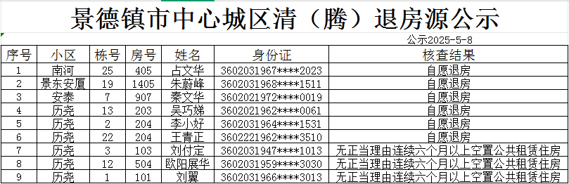 通过年审,经审核 ,安泰,景东安厦,南河,历尧共有9户住房保障对象,因不符合住房租赁管理条件等原因自愿退出。依据《公共租赁住房管理办法》(住建部第11号令)、《关于加快发展公共租赁住房的指导意见》(建保【2010】87号)、《公共租赁住房管理办法》景府办发〔2023〕7 号等相关文件对保障房实行动态管理的要求,现对上述住房保障对象作出取消其相应住房保障资格的决定。