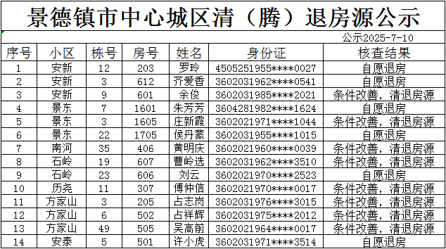 通过年审,经审核 ,安新,石岭,安泰,方家山,景东安厦,南河,历尧共有14户住房保障对象,因条件改善等原因自愿退出。依据《公共租赁住房管理办法》(住建部第11号令)、《关于加快发展公共租赁住房的指导意见》(建保【2010】87号)、《公共租赁住房管理办法》景府办发〔2023〕7 号等相关文件对保障房实行动态管理的要求,现对上述住房保障对象作出取消其相应住房保障资格的决定。