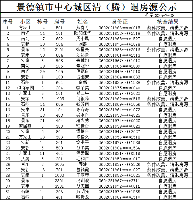 通过年审,经审核 ,安新,石岭,安泰,方家山,景东安厦,南河,历尧,安宇,和谐家园共有32户住房保障对象,因条件改善等原因自愿退出。依据《公共租赁住房管理办法》(住建部第11号令)、《关于加快发展公共租赁住房的指导意见》(建保【2010】87号)、《公共租赁住房管理办法》景府办发〔2023〕7 号等相关文件对保障房实行动态管理的要求,现对上述住房保障对象作出取消其相应住房保障资格的决定。