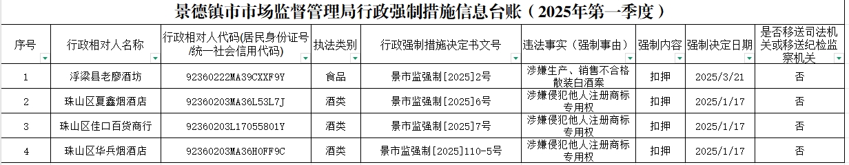 景德镇市市场监督管理局行政强制措施信息台账(2025年第一季度)