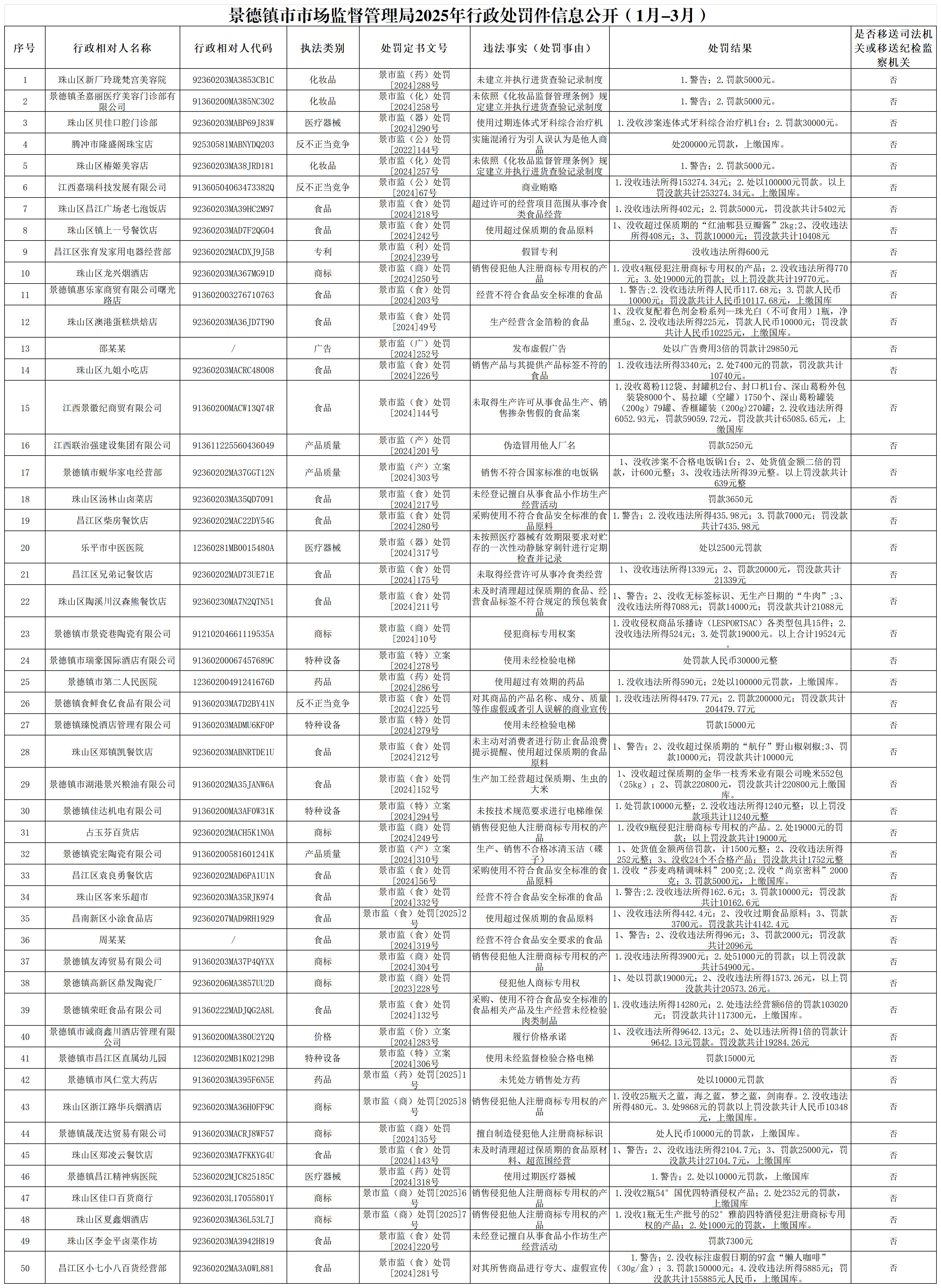 景德镇市市场监督管理局2025年行政处罚案件信息公开(1月-3月)