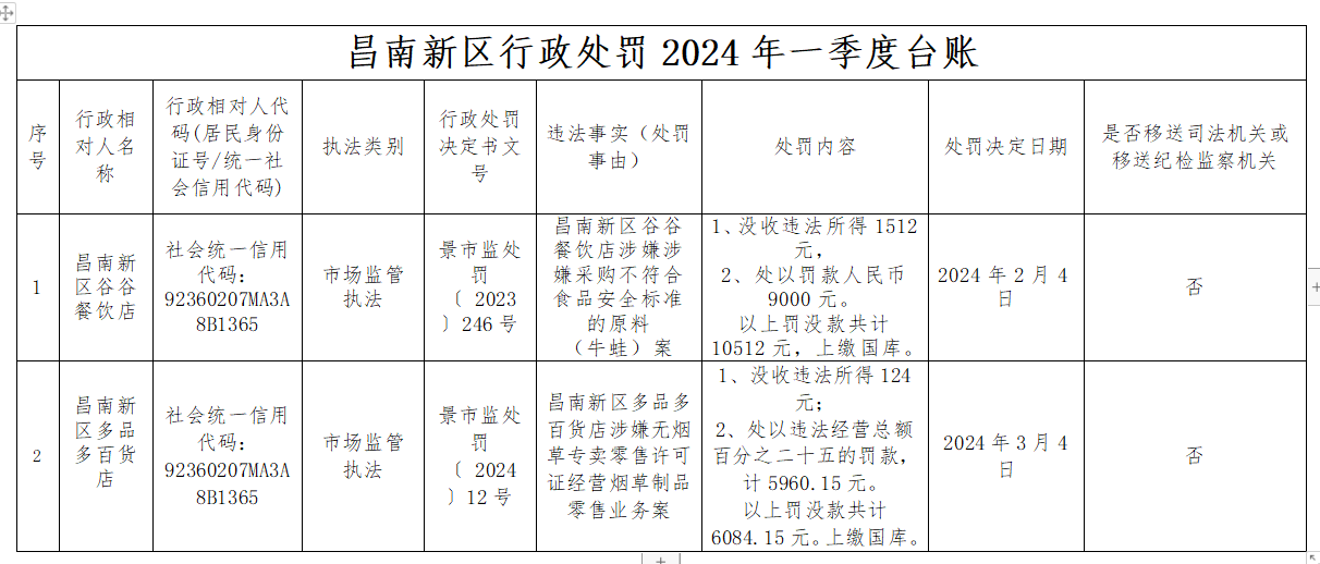2024年第1季度昌南新区市场监督管理局行政处罚信息台账