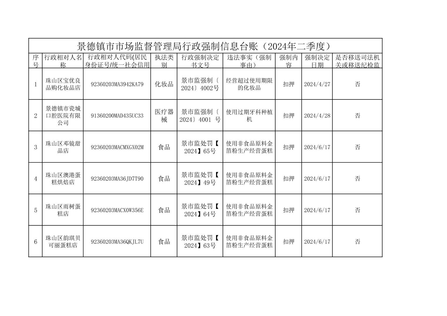 景德镇市市场监督管理局2024年行政强制信息公开(4月-6月)
