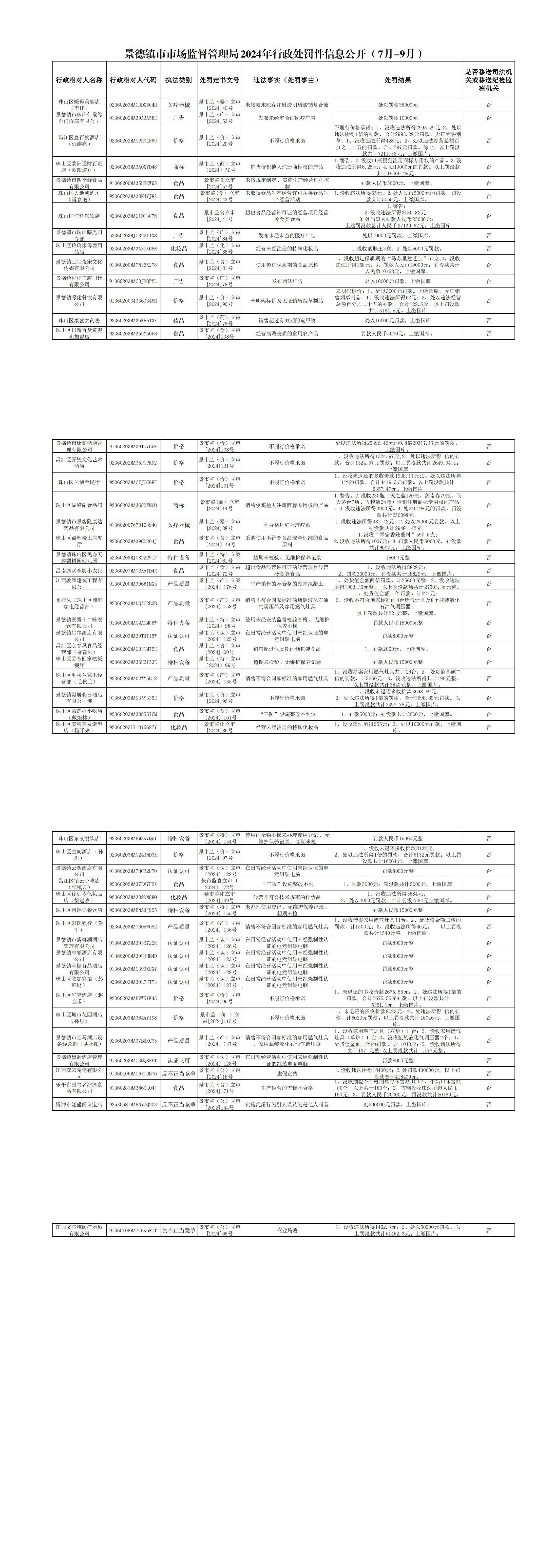 景德镇市市场监督管理局2024年行政处罚案件信息公开(7月—9月)