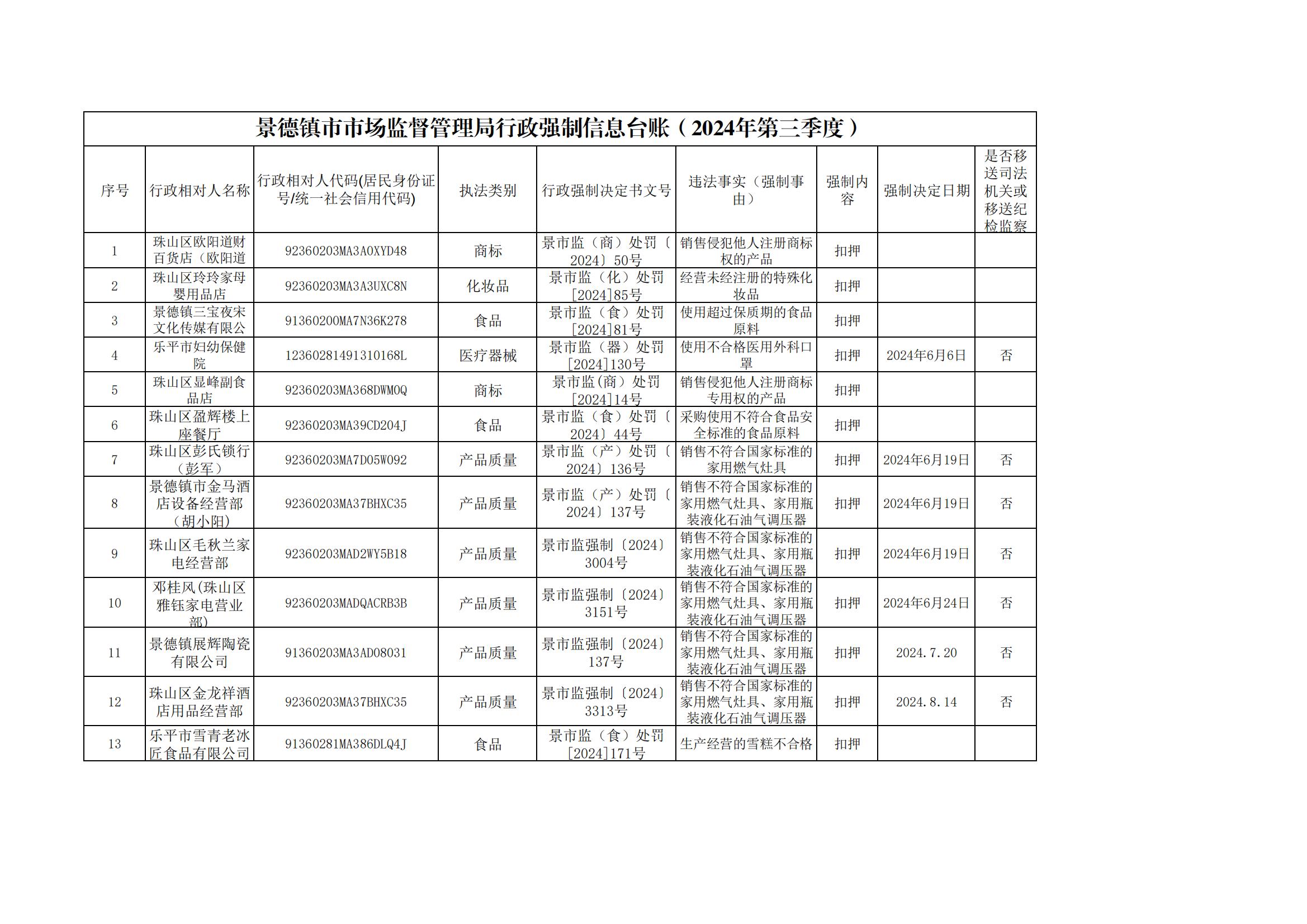 景德镇市市场监督管理局行政强制信息台账(2024年第三季度)