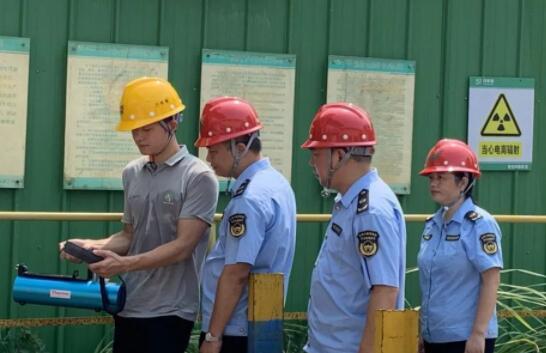 在市生态环境局党组成员童茜炜的带领下,相关辐射监测人员携带X、γ辐射剂量率仪对市辖区内江西乐平万年青水泥有限公司的中子放射源开展辐射监测。监测人员首先对X、γ辐射剂量率仪进行开机调试,测量环境中辐射本底值,随后在中子源的四周进行实时测量。