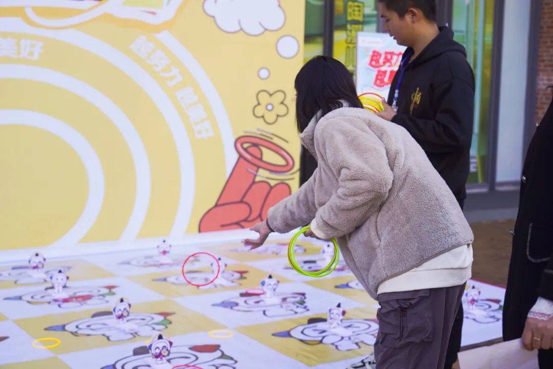 现场最火热的区域的当属“好彩圈圈乐”环节,活动区域排起了长队,人气十足。“这可太有挑战性了,努力瞄准乐小星,直接就是一个投圈,一投一个准!”一个小伙子成功套中了乐小星立牌,盖上印章后向朋友展示着自己在集章卡上的“战绩”。