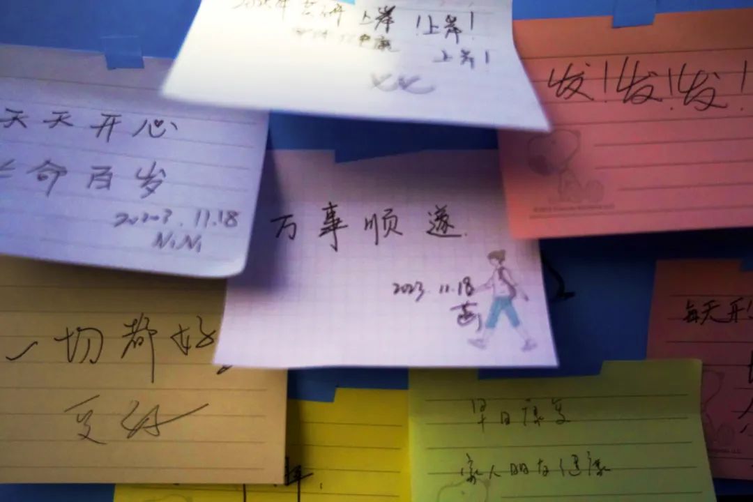 微风伴随着初冬暖阳,吹动着许愿区贴满展墙的愿望贴。“平安喜乐”“健康顺遂”……大家纷纷写下了日常生活中的“小确幸”,还有几位00后贴上了“上岸”“今晚中奖”的留言,蹦跳着将许愿签贴向高处。