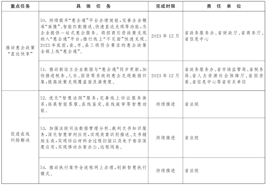 十三、促进在线纠纷解决。优化“智慧法院”服务,完善线上诉讼服务体系,拓展智能客服、在线鉴定、在线庭审等智慧功能。加强司法数据管理分析、裁判文书知识服务,深化智慧审判应用。推动执行案件全流程网上办理,创新智慧执行模式。(责任单位:省法院)